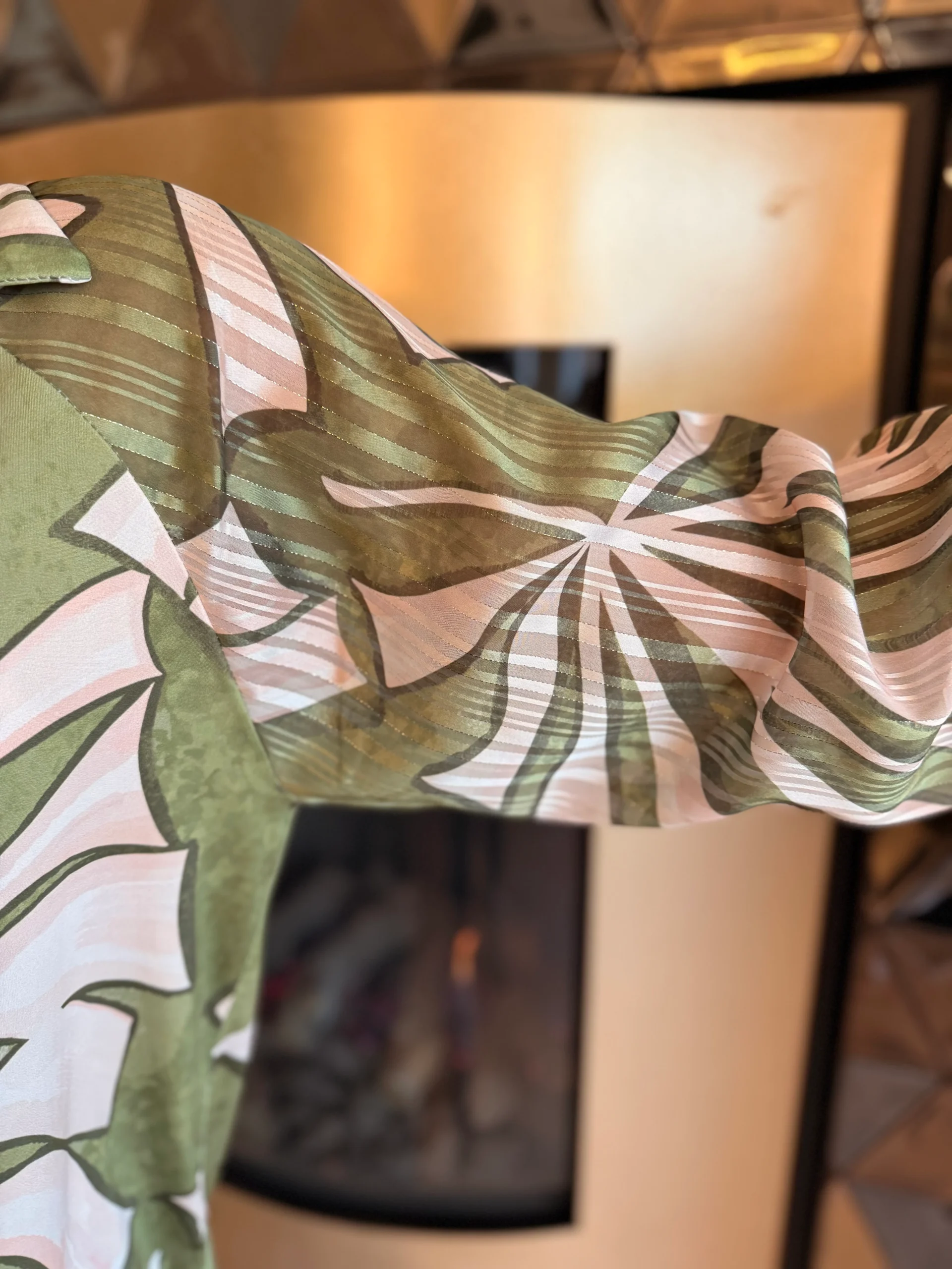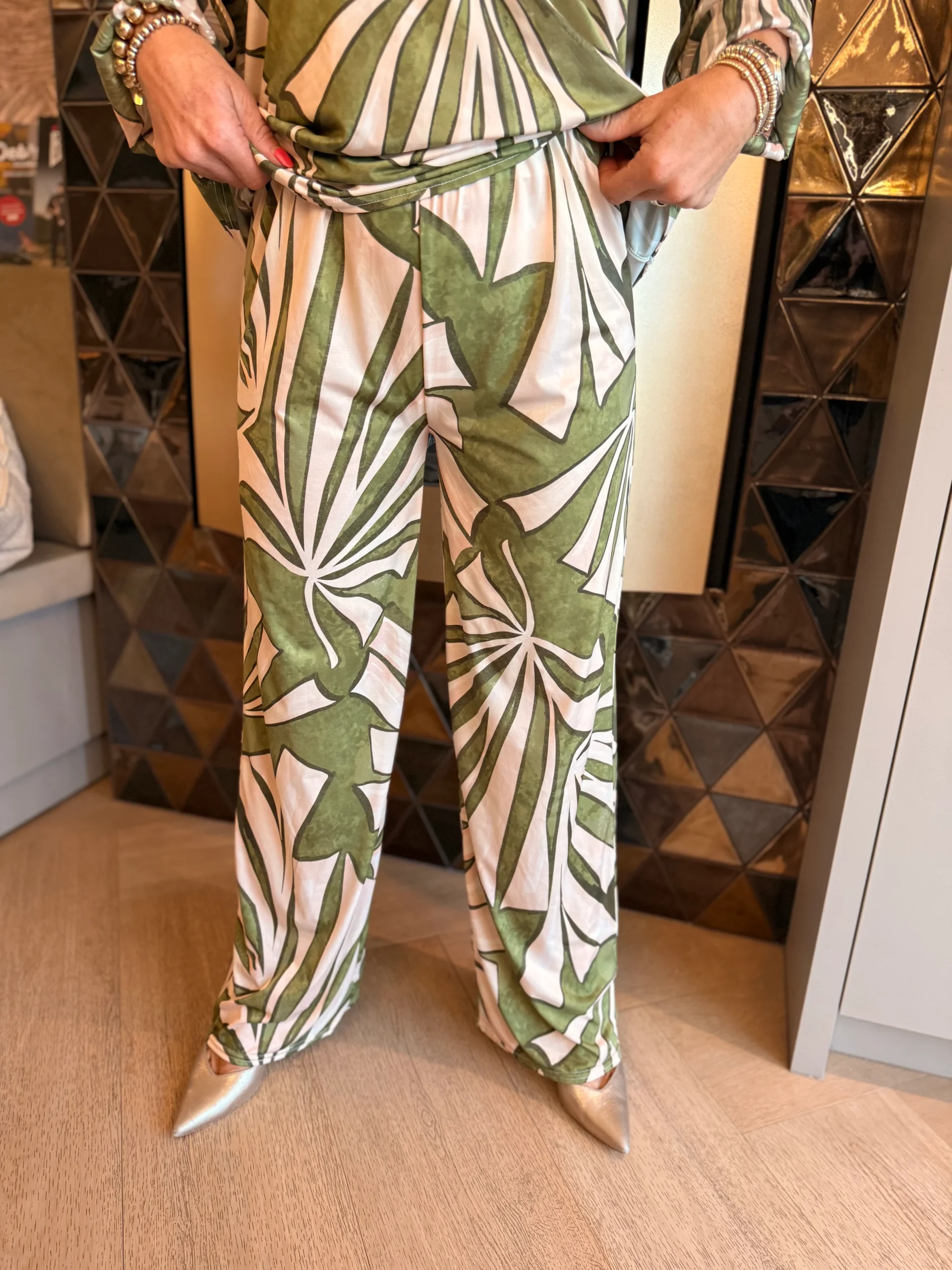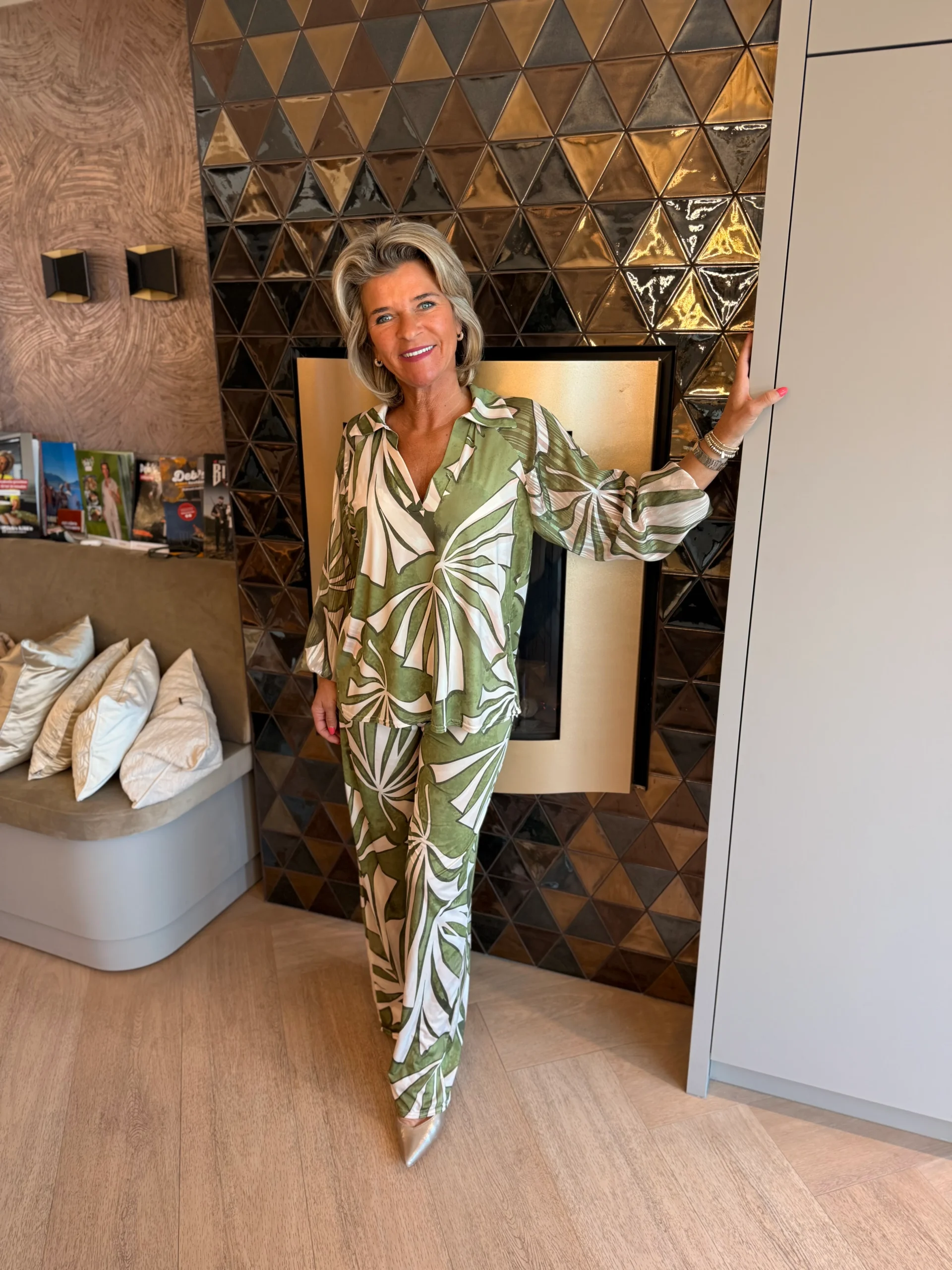 Deze stijlvolle set met blouse en broek in een prachtige print is een echte eyecatcher. De blouse heeft een kraag met een elegante V-hals en is afgewerkt met luchtige voile mouwen waarin een subtiele gouden draad is verwerkt, voor een verfijnde en luxe uitstraling. De lengte van de blouse is 64 cm.