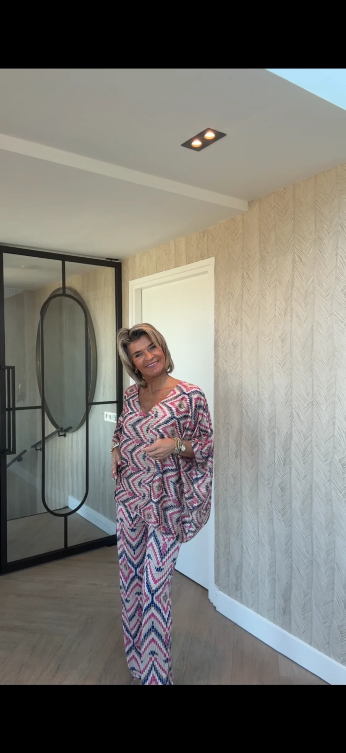 Deze set met luxe grafische print straalt stijl en elegantie uit. Het subtiel ingeweven gouden draadje geeft een verfijnde shimmer en zorgt voor een chique touch. De comfortabele stof en mooie pasvorm maken deze set perfect voor zowel een casual als een meer geklede look.