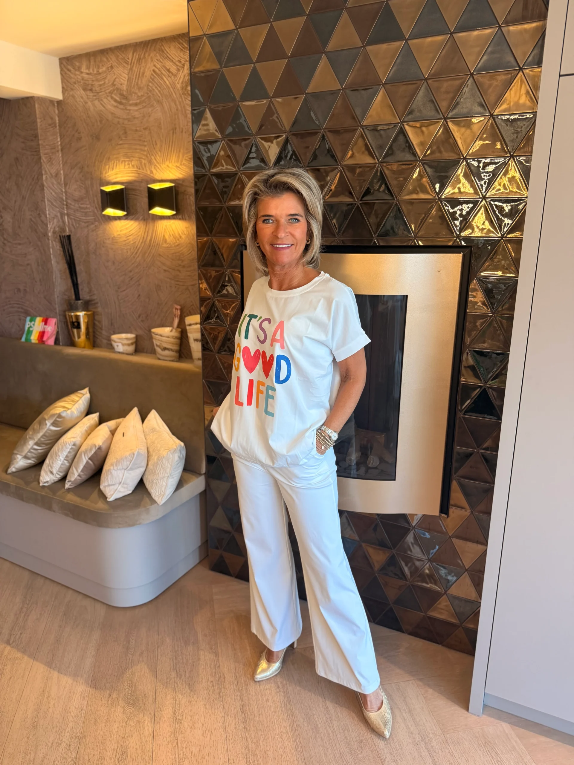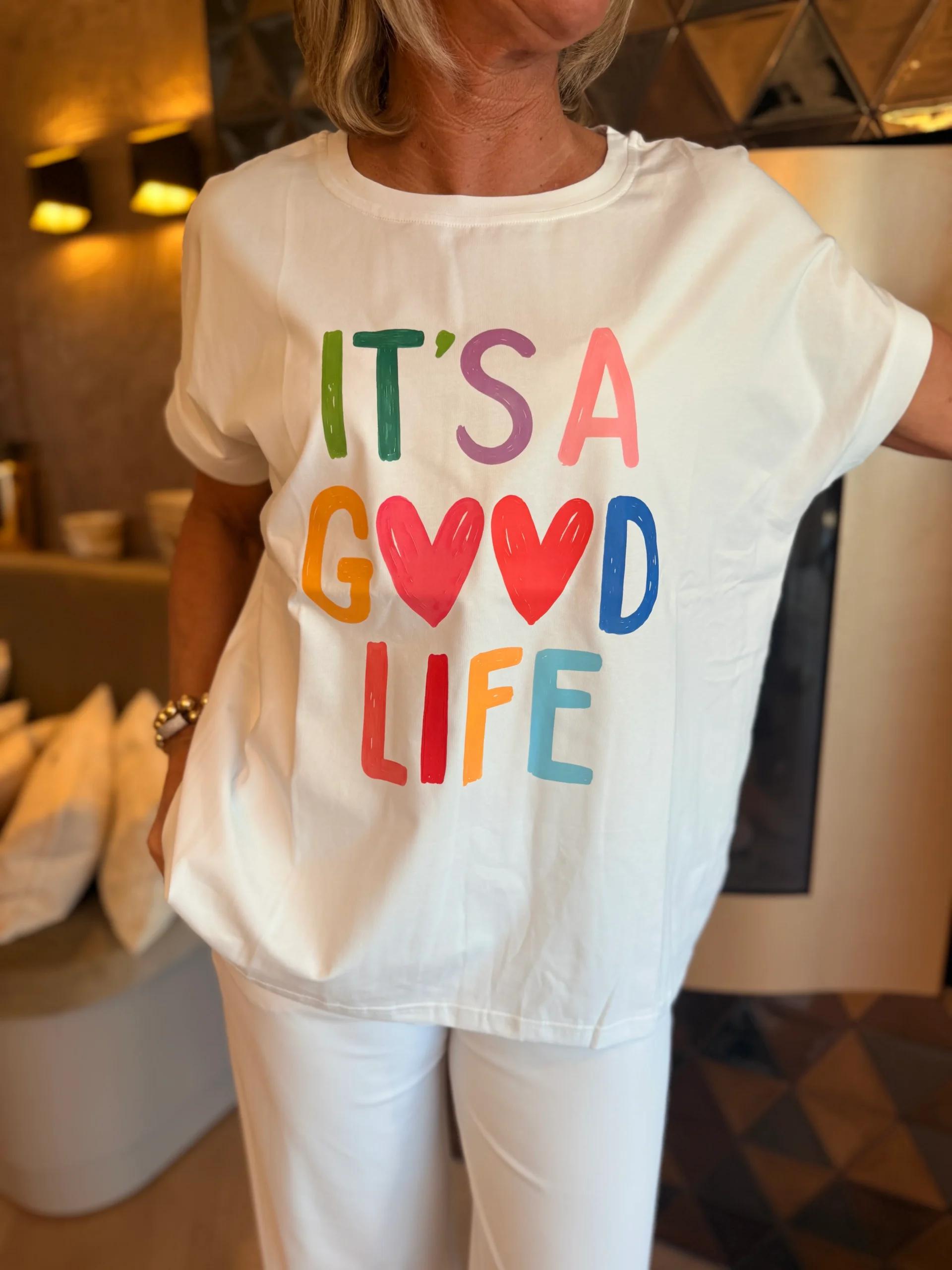 T-shirt met de tekst “it’s a good life”. Het shirt heeft een ronde hals en korte mouwen en is verkrijgbaar in verschillende kleuren. Een comfortabel en makkelijk te combineren item voor een casual, positieve look.