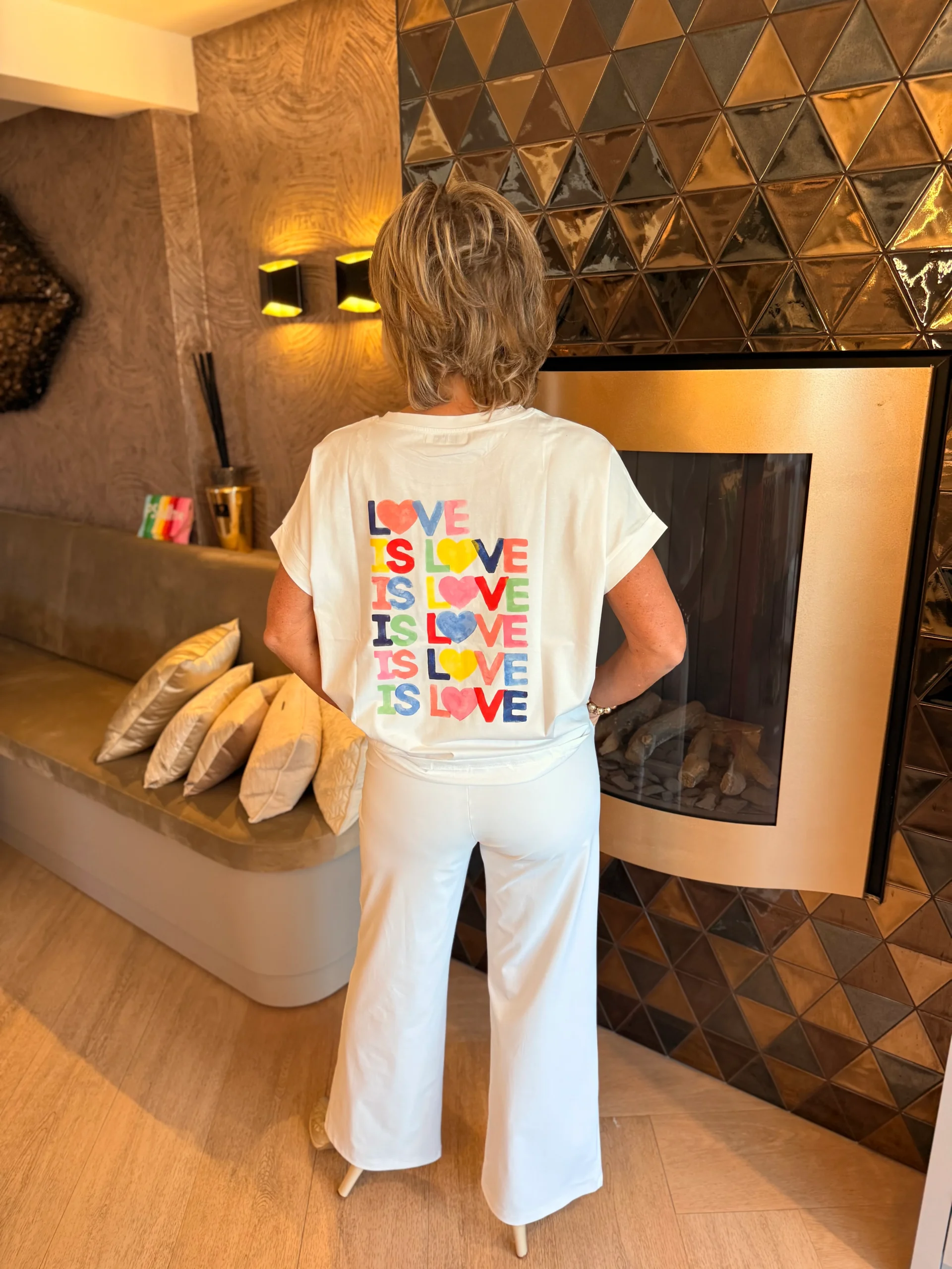 T-shirt met op de achterkant gekleurde letters met de tekst “love is love”. Het shirt heeft een ronde hals en korte mouwen en is verkrijgbaar in verschillende kleuren. Een vrolijk en comfortabel item met een krachtige boodschap, perfect voor een casual look.