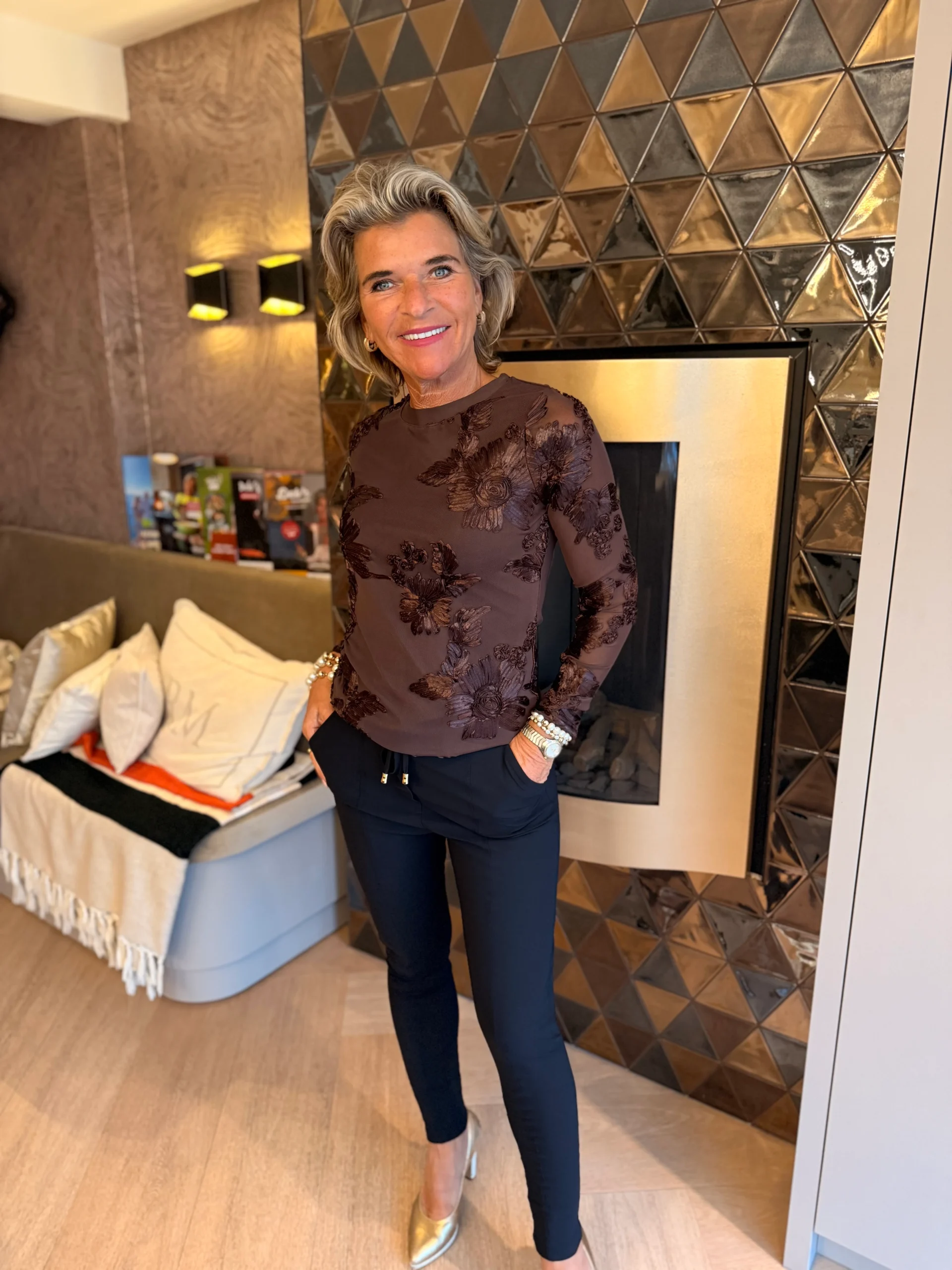 Deze top is een echte blikvanger. De semi-transparante stof geeft het shirt een elegante, luchtige uitstraling, terwijl de verfijnde geborduurde bloemen zorgen voor een luxe, gedetailleerde finish. Dankzij de comfortabele stretch sluit het mooi aan op het lichaam en is het perfect te stylen voor zowel een alledaagse look als een avondje uit.