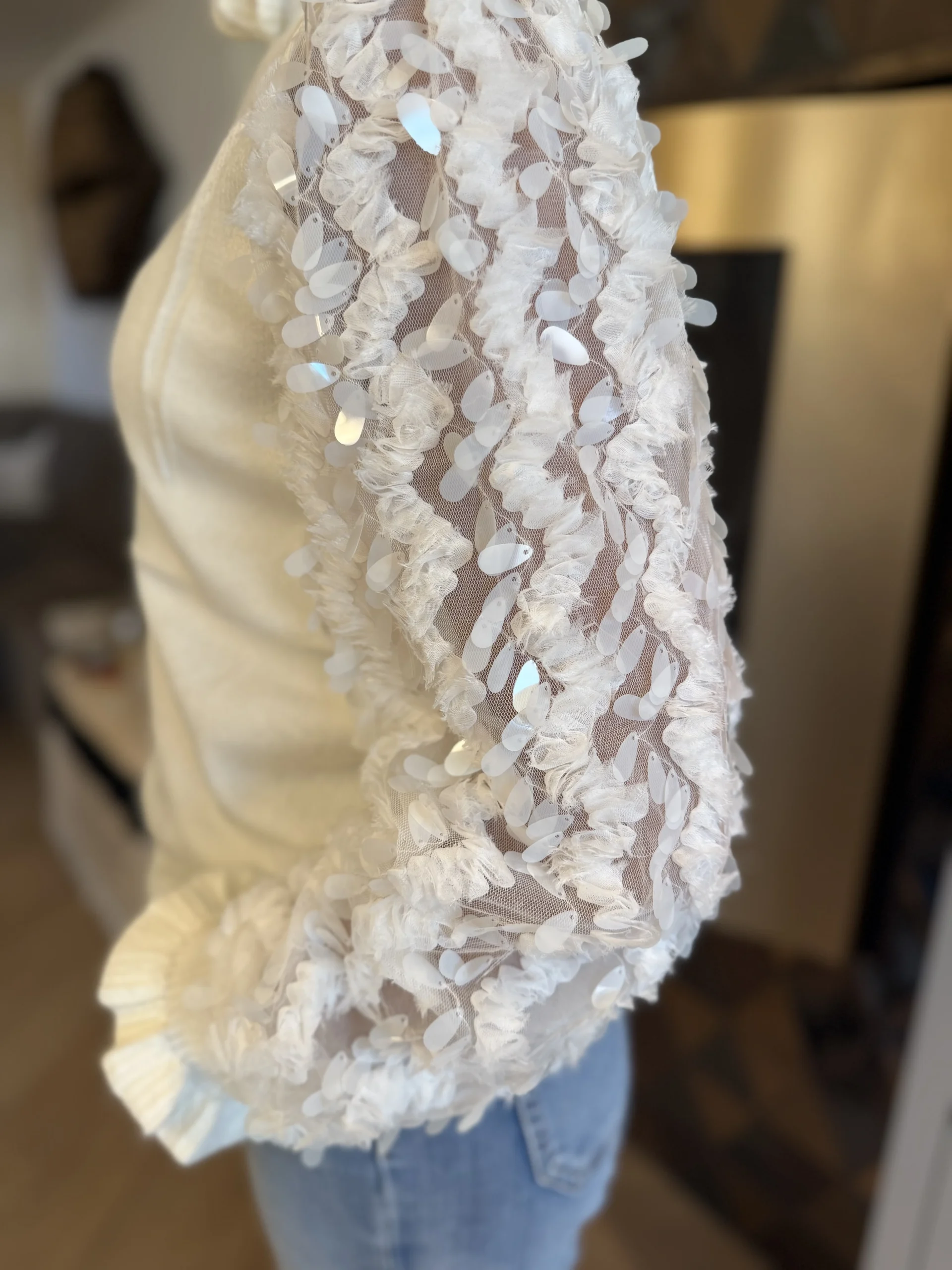 Stijlvolle trui met een speels roeselrandje en doorzichtige mouwen versierd met subtiele pailletten. De mouwen zijn afgewerkt met een boordje en roeselrand, terwijl de onderkant van de trui recht loopt met een boord voor een nette afwerking. Een elegant en feestelijk item voor een opvallende look.