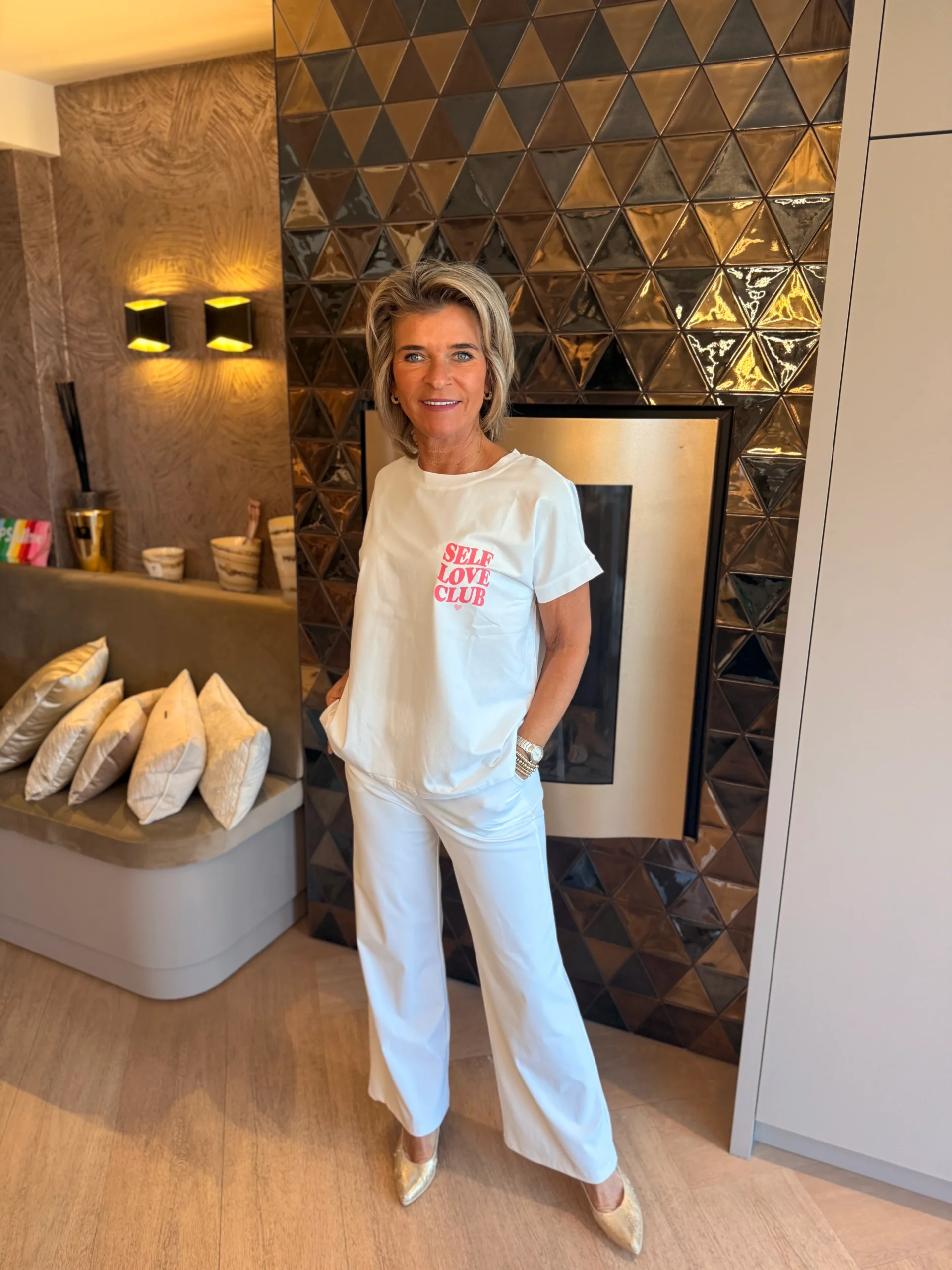T-shirt met op de achterkant de tekst “Self Love Club” in roze letters. Het shirt heeft een ronde hals en korte mouwen en is verkrijgbaar in verschillende kleuren. Een stijlvol en comfortabel item met een positieve boodschap, perfect voor een casual look.