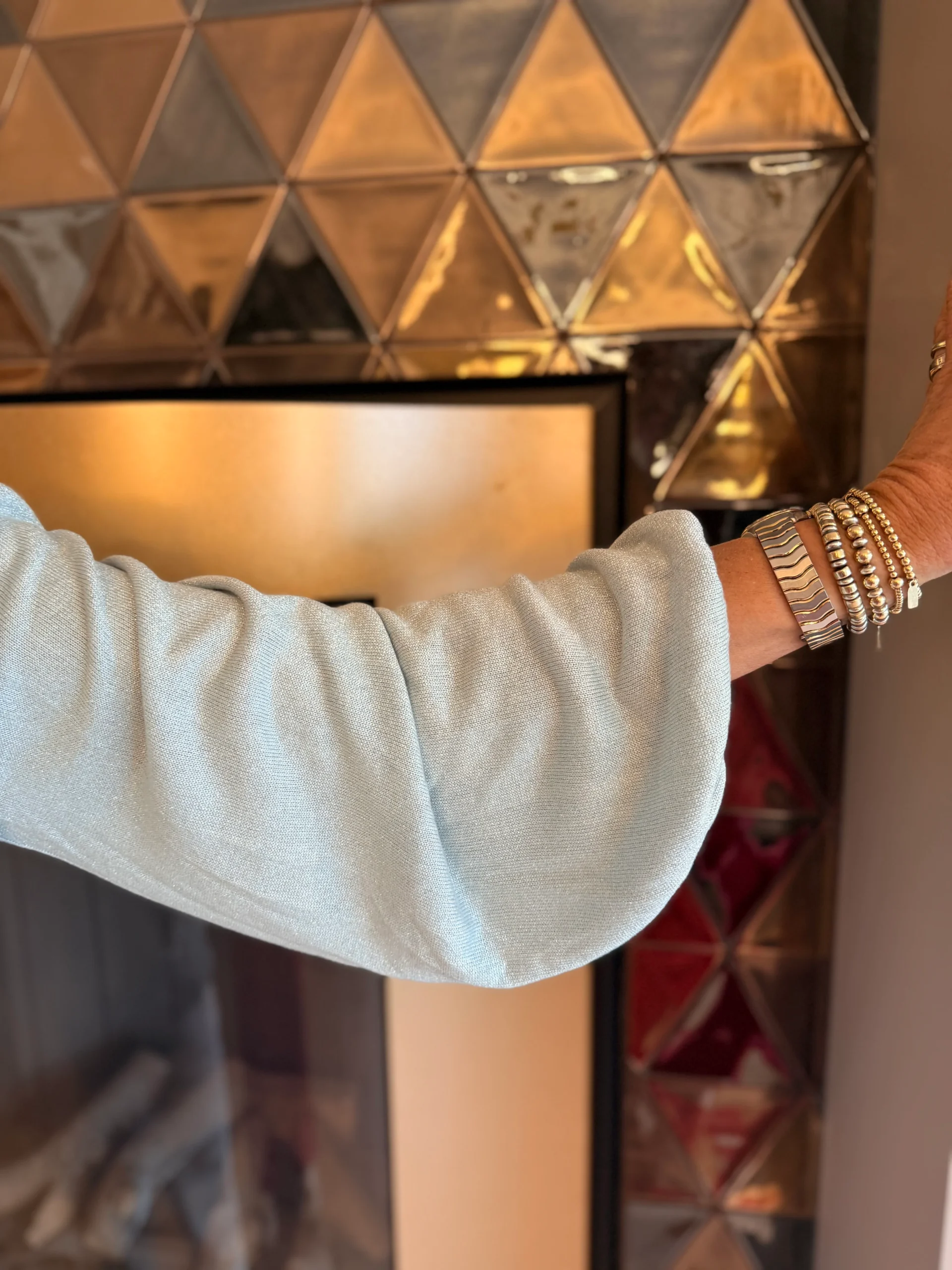Dit shirt heeft lange mouwen en een vrouwelijke V-hals. De mouwen hebben bovenaan een subtiele pof, wat zorgt voor een speelse en elegante uitstraling. Onderaan de mouwen zit elastiek, waardoor ze mooi aansluiten.