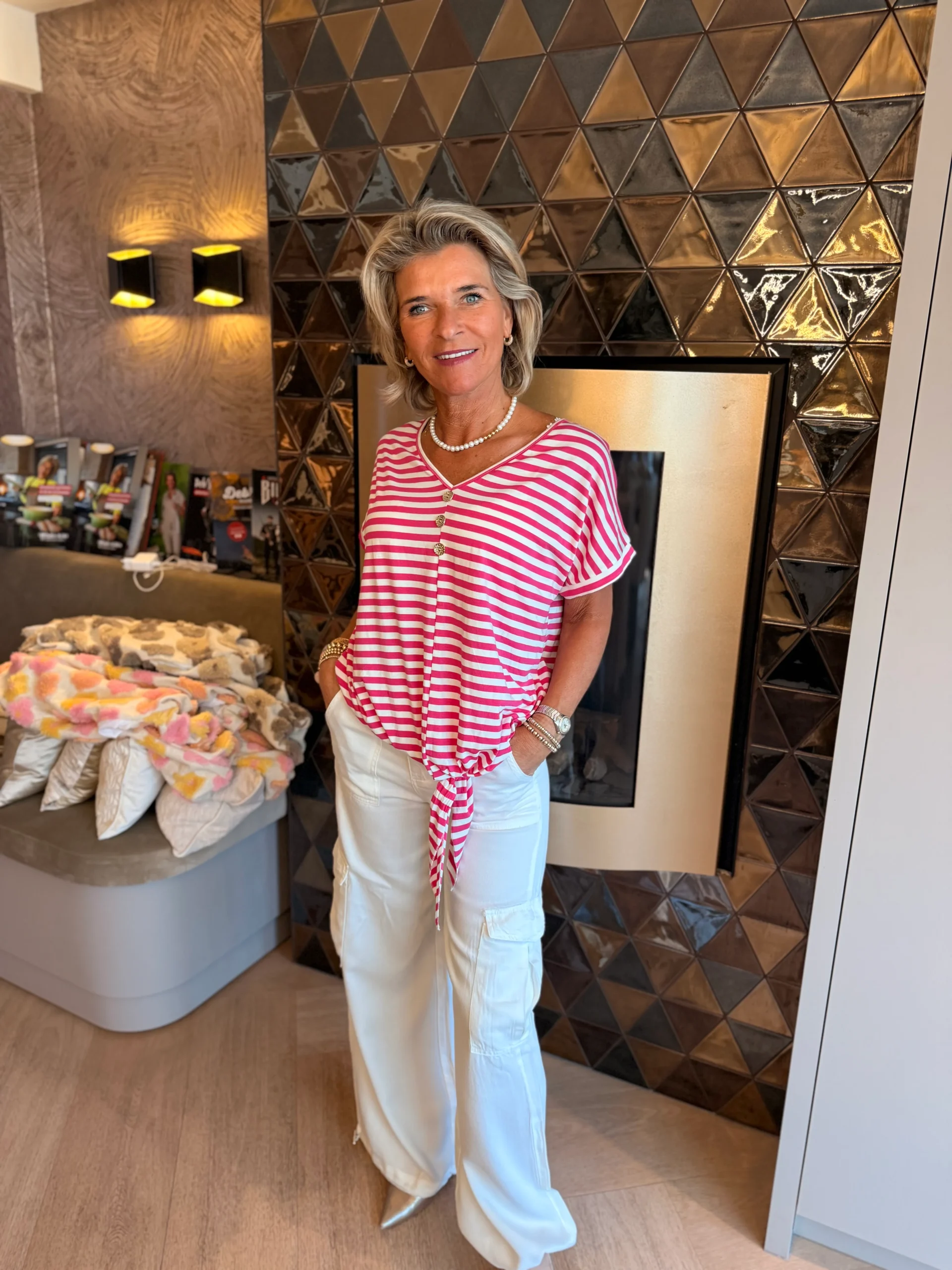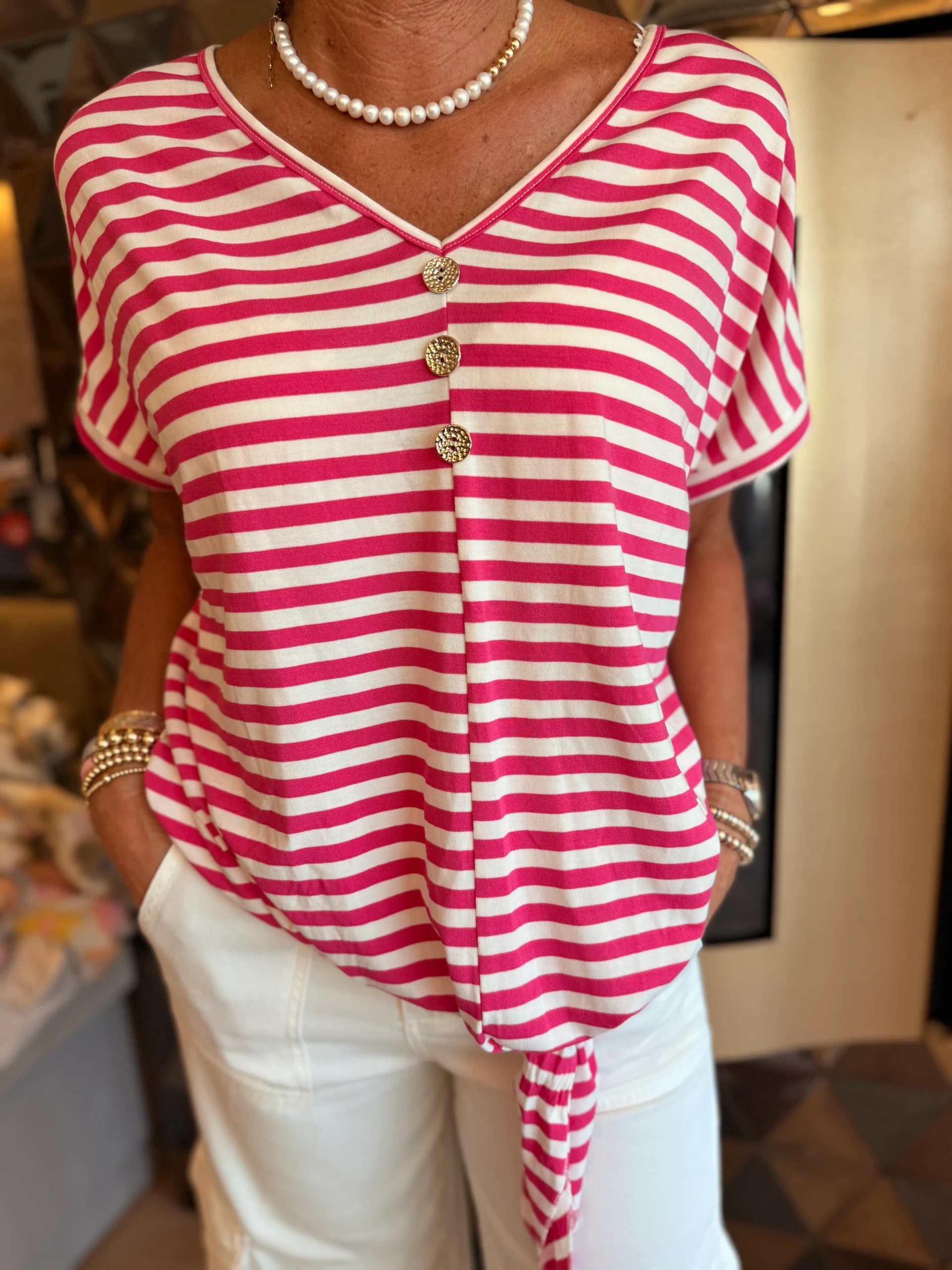 Dit gestreepte shirt heeft een frisse en casual uitstraling, perfect voor een zomerse look. Het shirt heeft korte mouwen en een vrouwelijke V-hals met daaronder drie knoopjes, wat zorgt voor een leuk en speels detail.