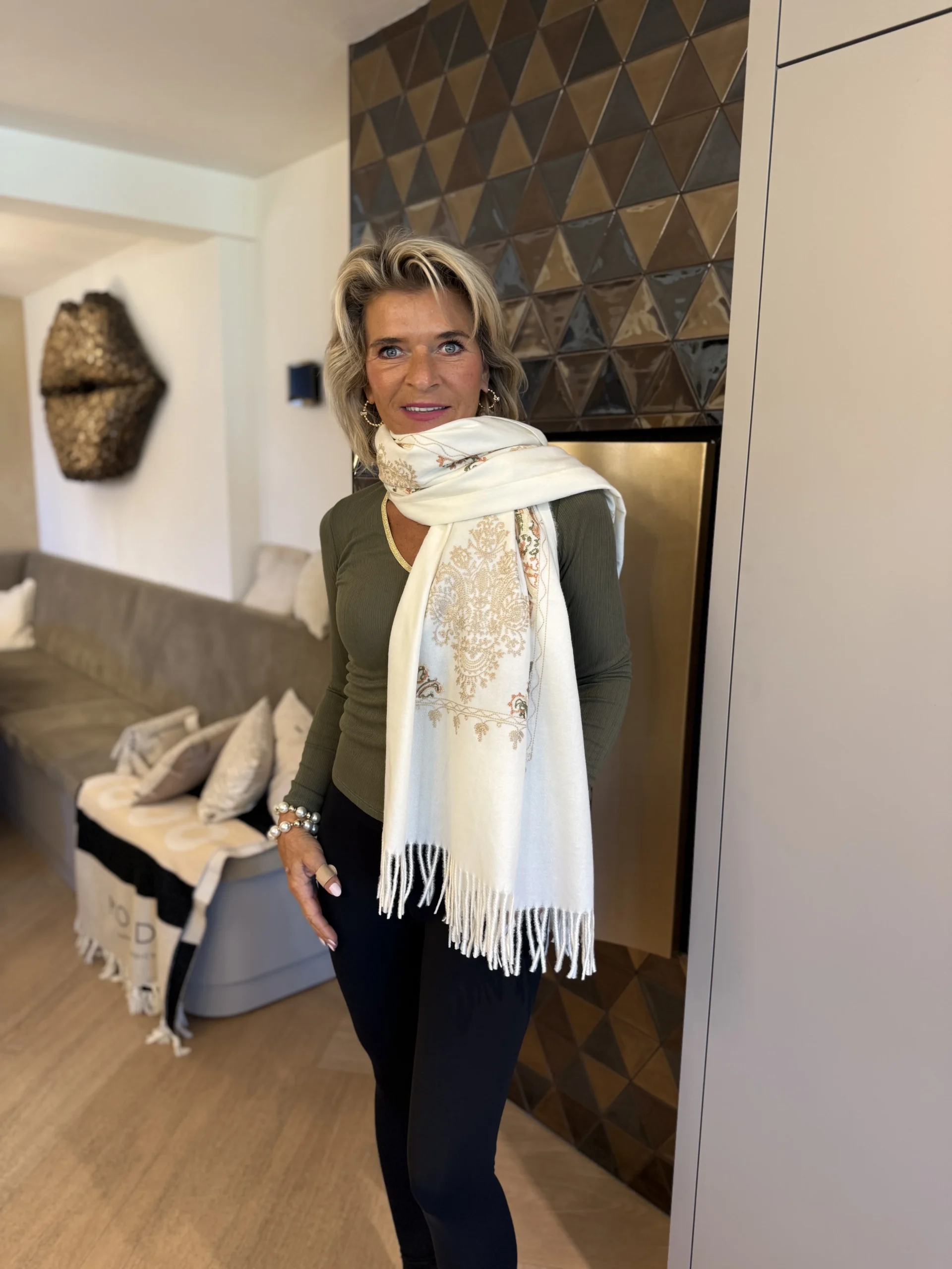 Deze stijlvolle ecru sjaal met gekleurde ornamenten en speelse franjes is een veelzijdige accessoire die elke outfit een elegante uitstraling geeft. Dankzij de royale afmeting van 185 cm lang en 72 cm breed kun je de sjaal op verschillende manieren dragen – losjes om de hals, nonchalant geknoopt of elegant om de schouders.