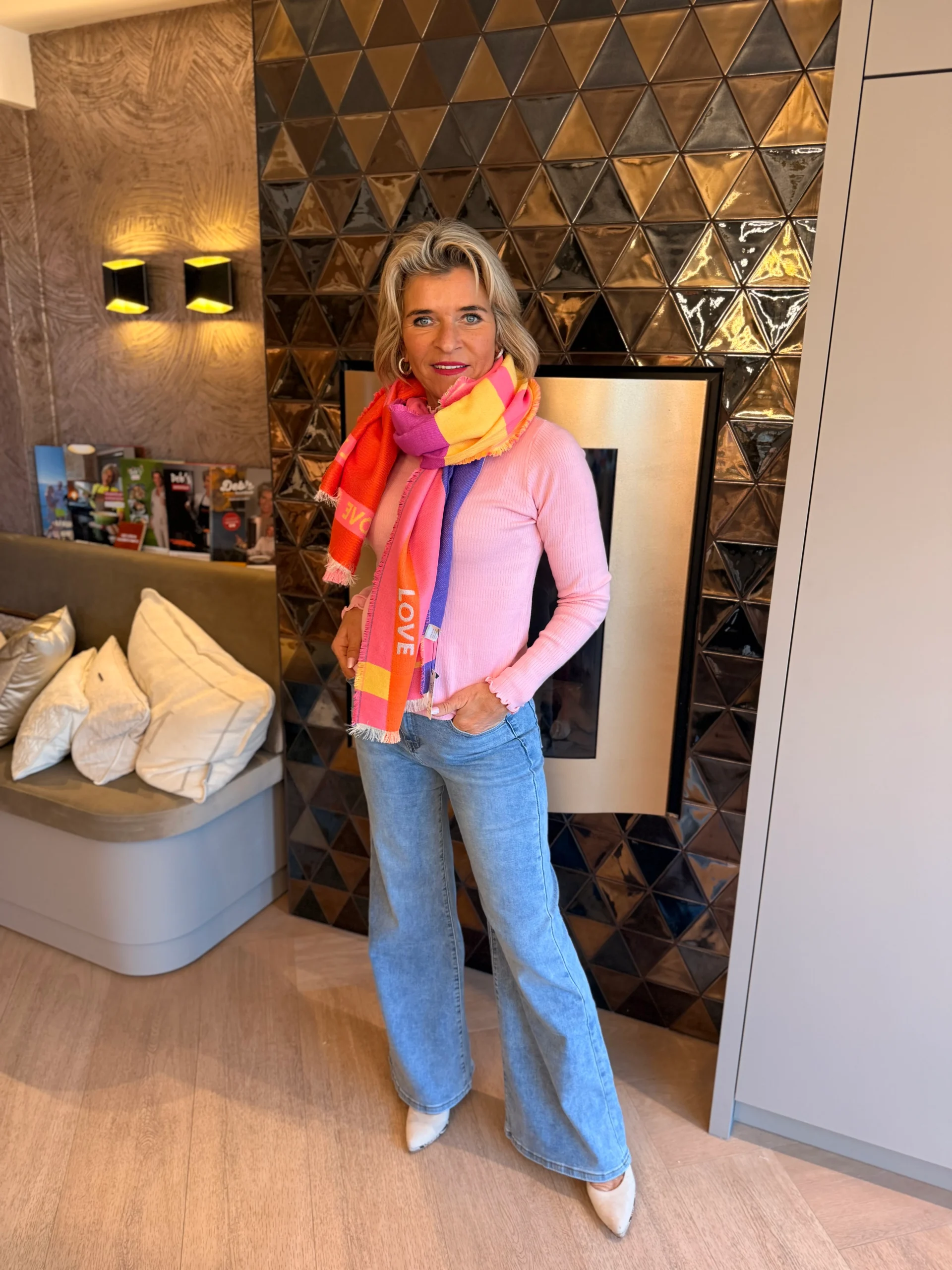 Zachte sjaal met de tekst “Love” in verschillende vrolijke kleuren, die een speels en modern accent toevoegt aan elke outfit. De onderkant is afgewerkt met een subtiel rafelrandje voor een casual, nonchalante uitstraling. Dankzij het veelzijdige formaat van 70 x 200cm is de sjaal perfect om op verschillende manieren te dragen: los over de schouders, om de hals gewikkeld of zelfs als lichte omslagdoek. Een kleurrijk en stijlvol accessoire dat je look meteen opfleurt.