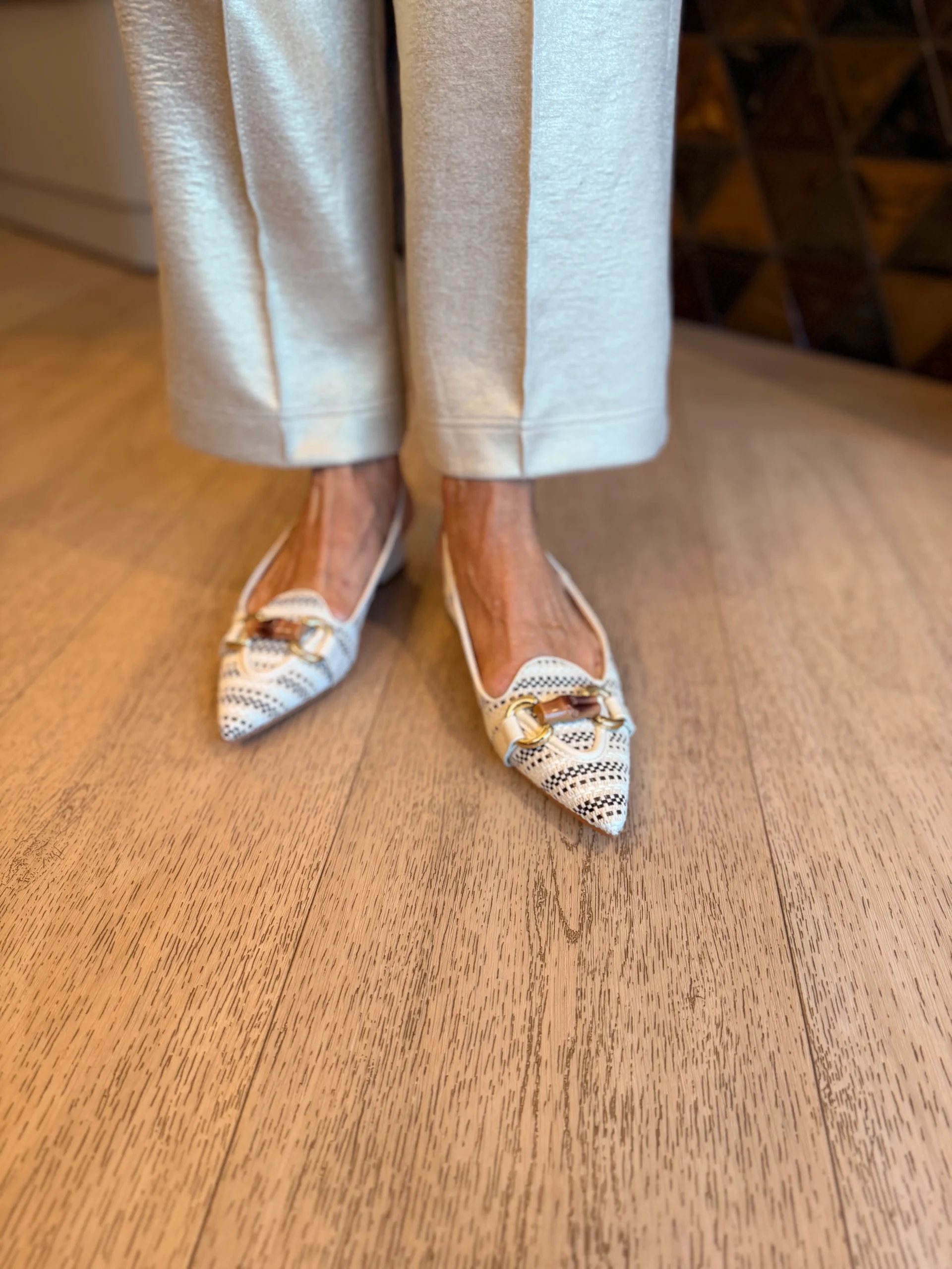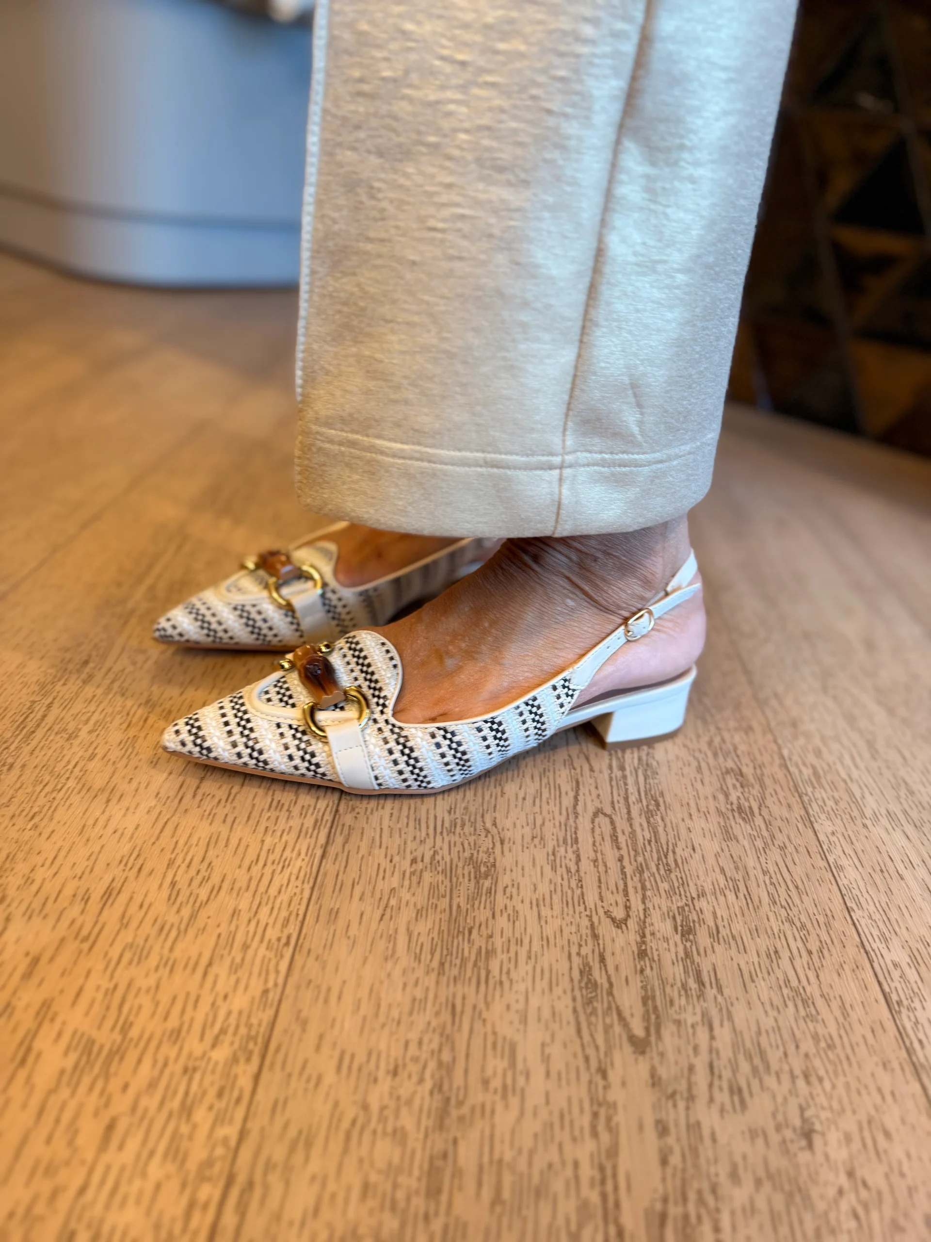 Deze schoen is een echte blikvanger. De puntige neus is afgewerkt met een gouden gesp en een bruine applicatie. Het gevlochten design in verschillende beige/bruintinten geeft de schoen een speelse, zomerse uitstraling. Het achterbandje en het kleine beige hakje zorgen voor een elegante finishing touch. Verkrijgbaar in maat 36 t/m 44.