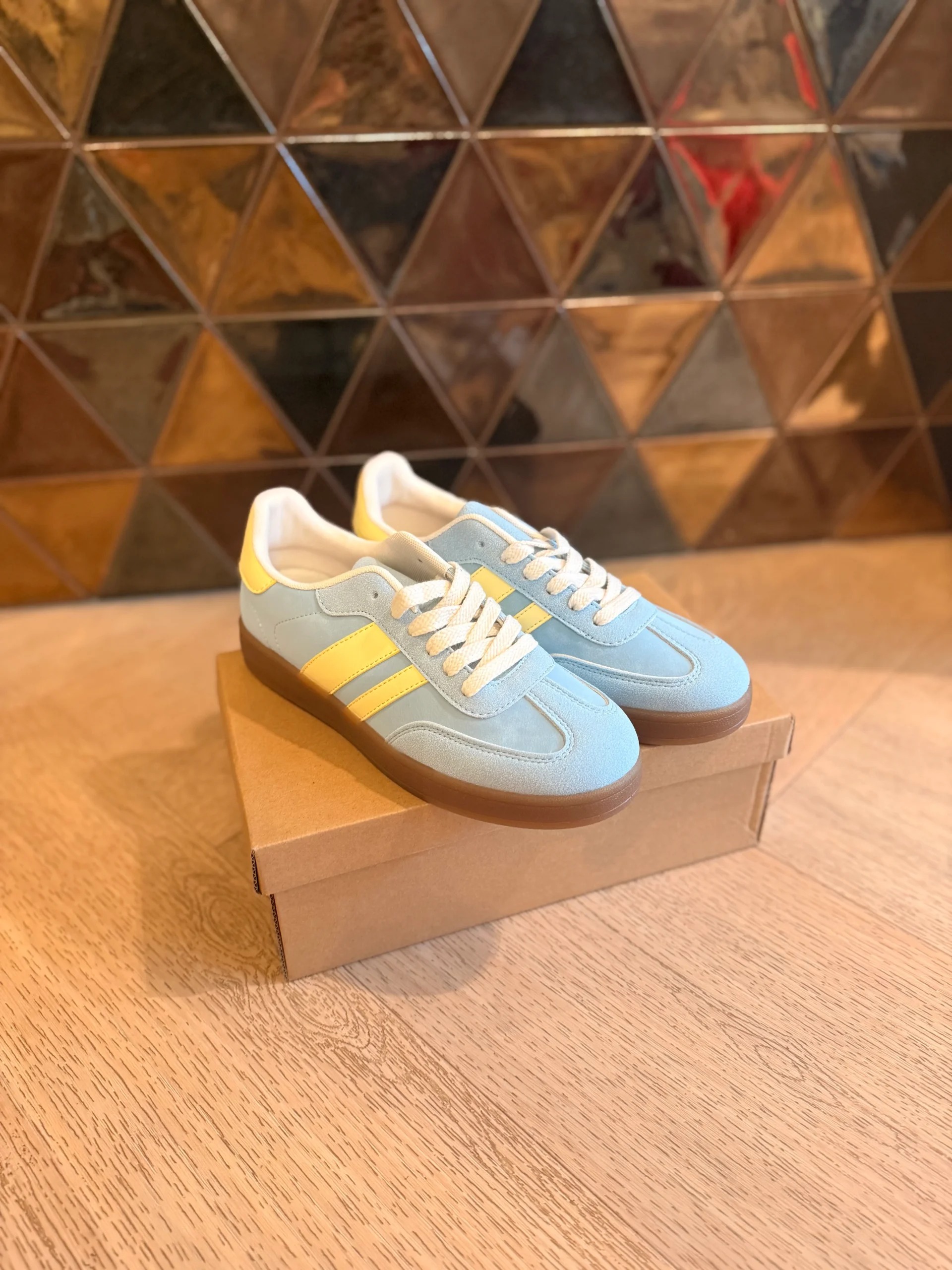 Deze lichtblauwe sneaker valt op door de vrolijke gele strepen aan de zijkant en de gele bovenkant van de hak. De witte veters geven een frisse touch en de dikke bruine zool met ribbels zorgt voor comfort én een stoere uitstraling. Perfect voor een casual, kleurrijke look die je overal mee naartoe neemt!