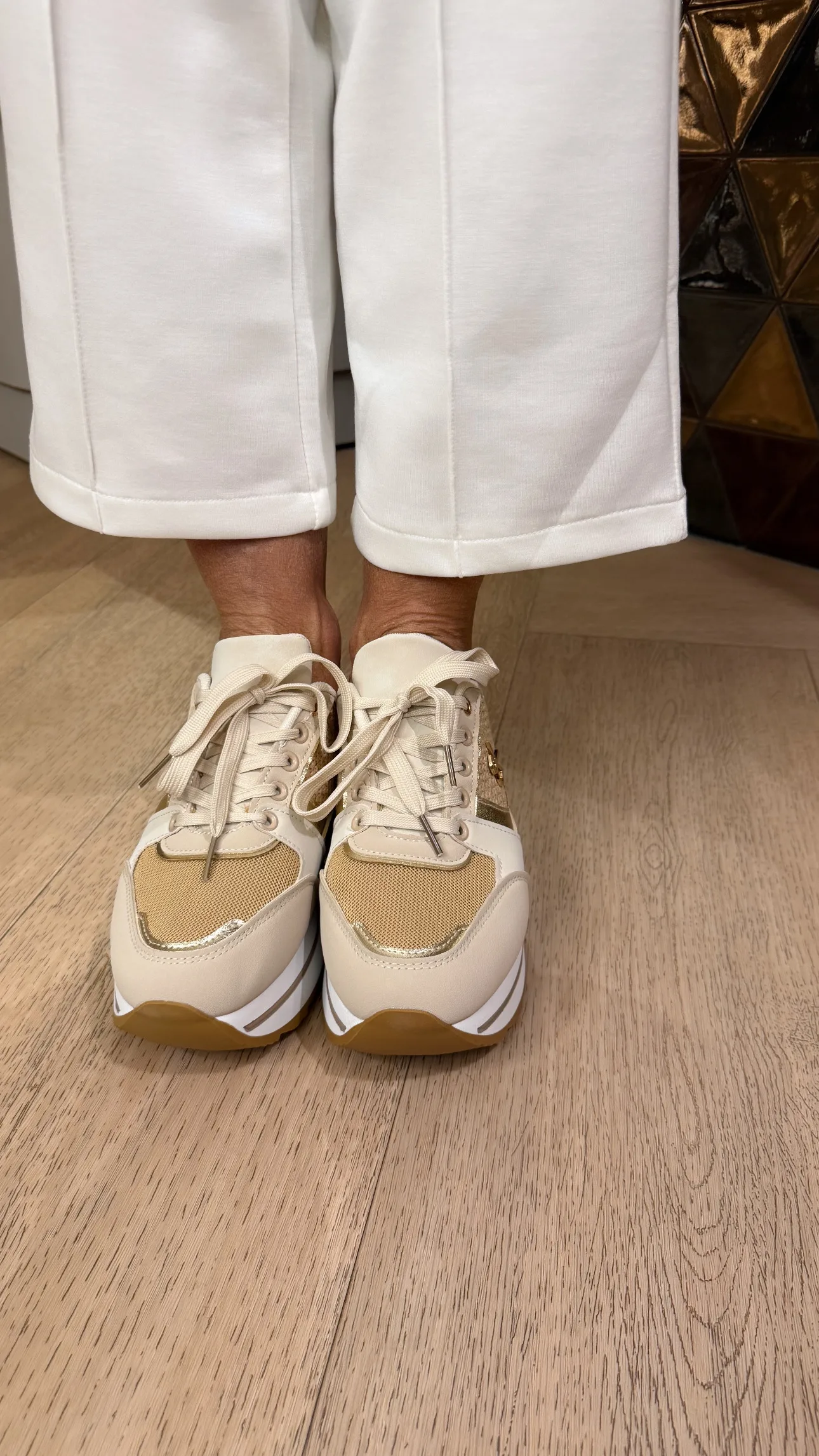 Een trendy sneaker met een hoge zool in prachtige natuurtinten. De stevige zool zorgt voor extra comfort en een moderne look, terwijl de zachte kleuren de sneaker makkelijk combineerbaar maken met elke outfit. Perfect voor een stijlvolle, casual uitstraling.