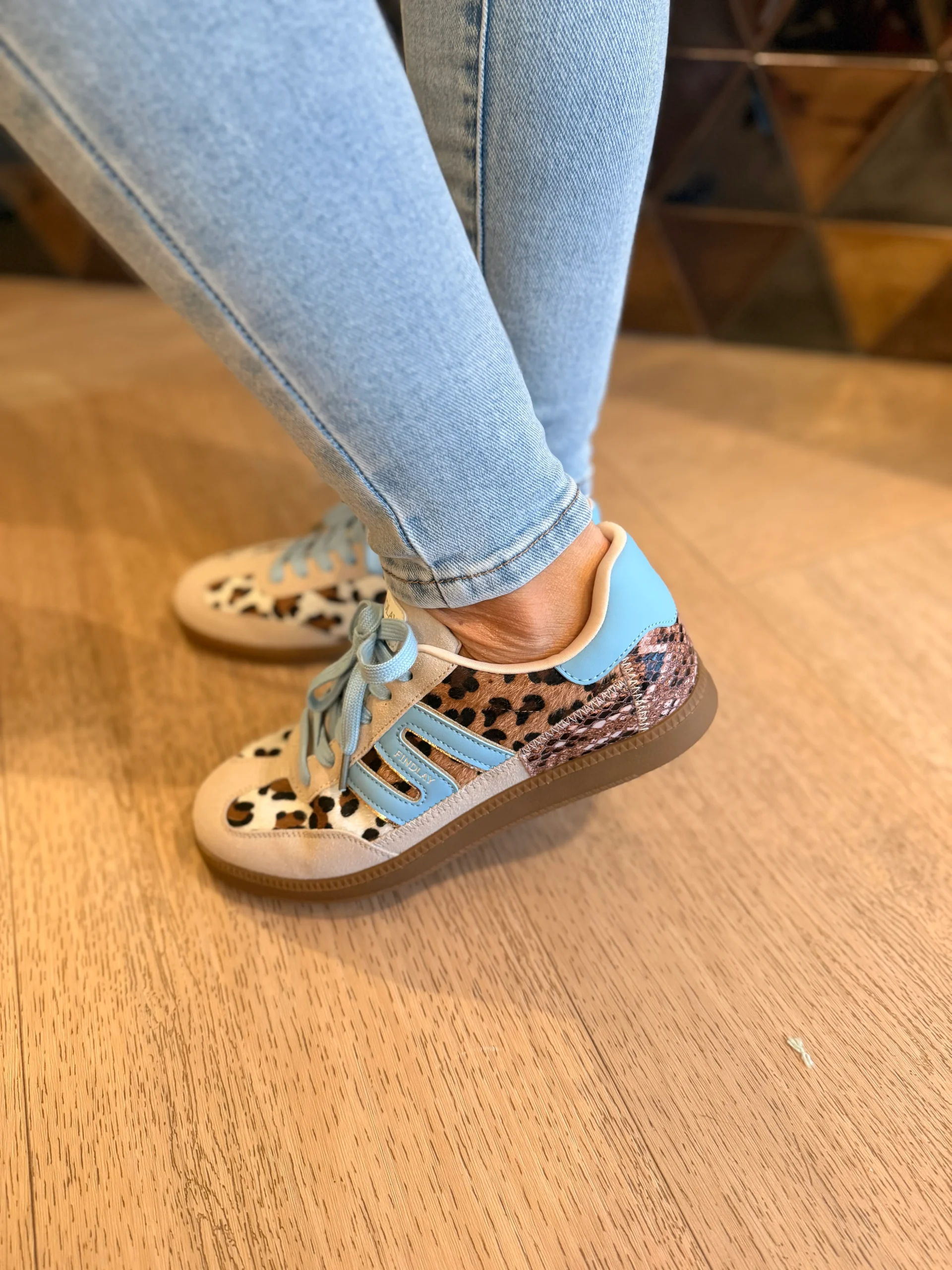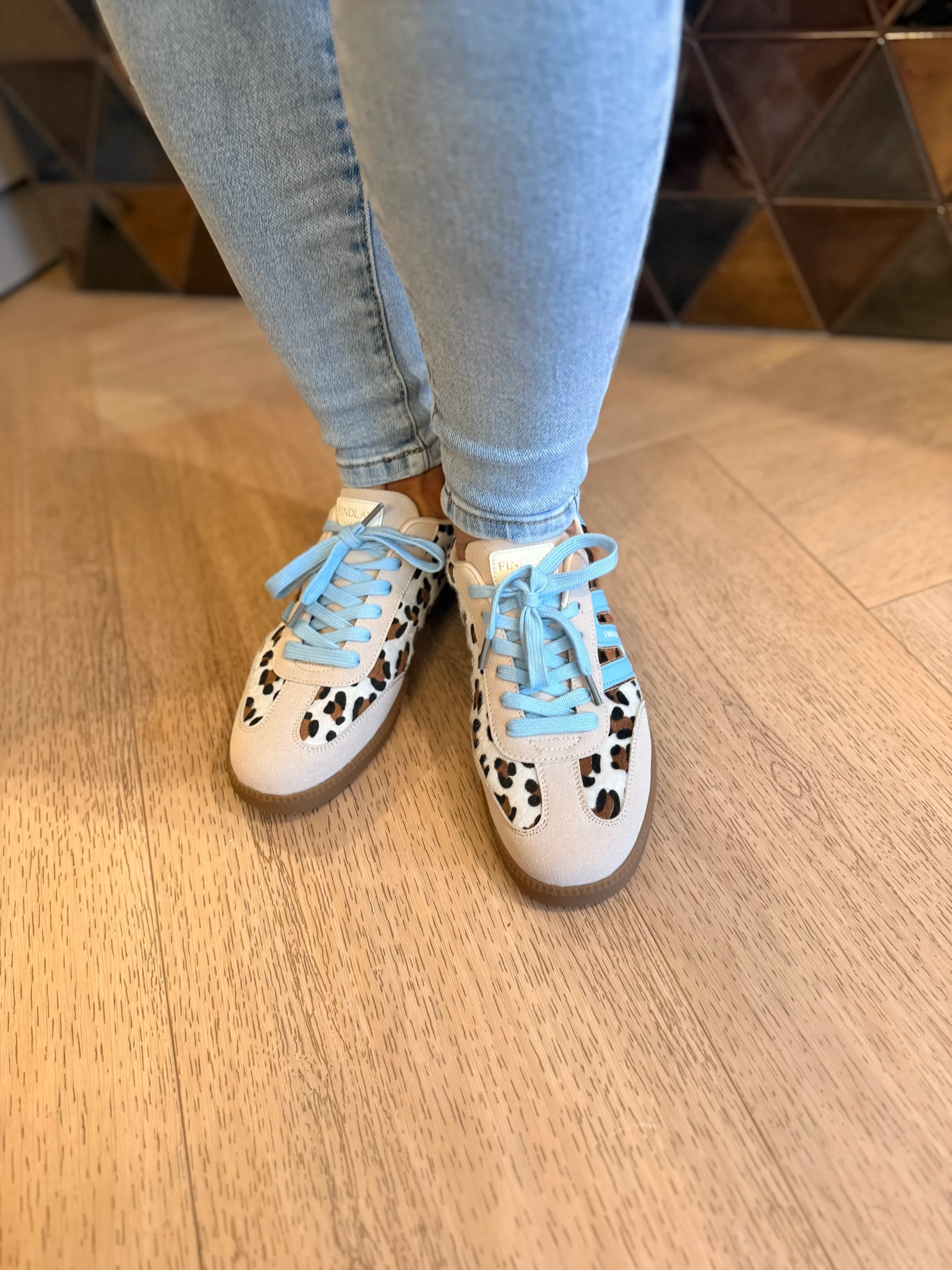 Deze sneaker met leopard print is dé eyecatcher voor je outfit! De beige accenten zorgen voor een rustige basis, terwijl de lichtblauwe veter en hak een frisse twist geven. Afgewerkt met een bruine, dunne zool voor een stijlvolle en comfortabele look. Perfect om elke outfit nét dat beetje extra te geven.