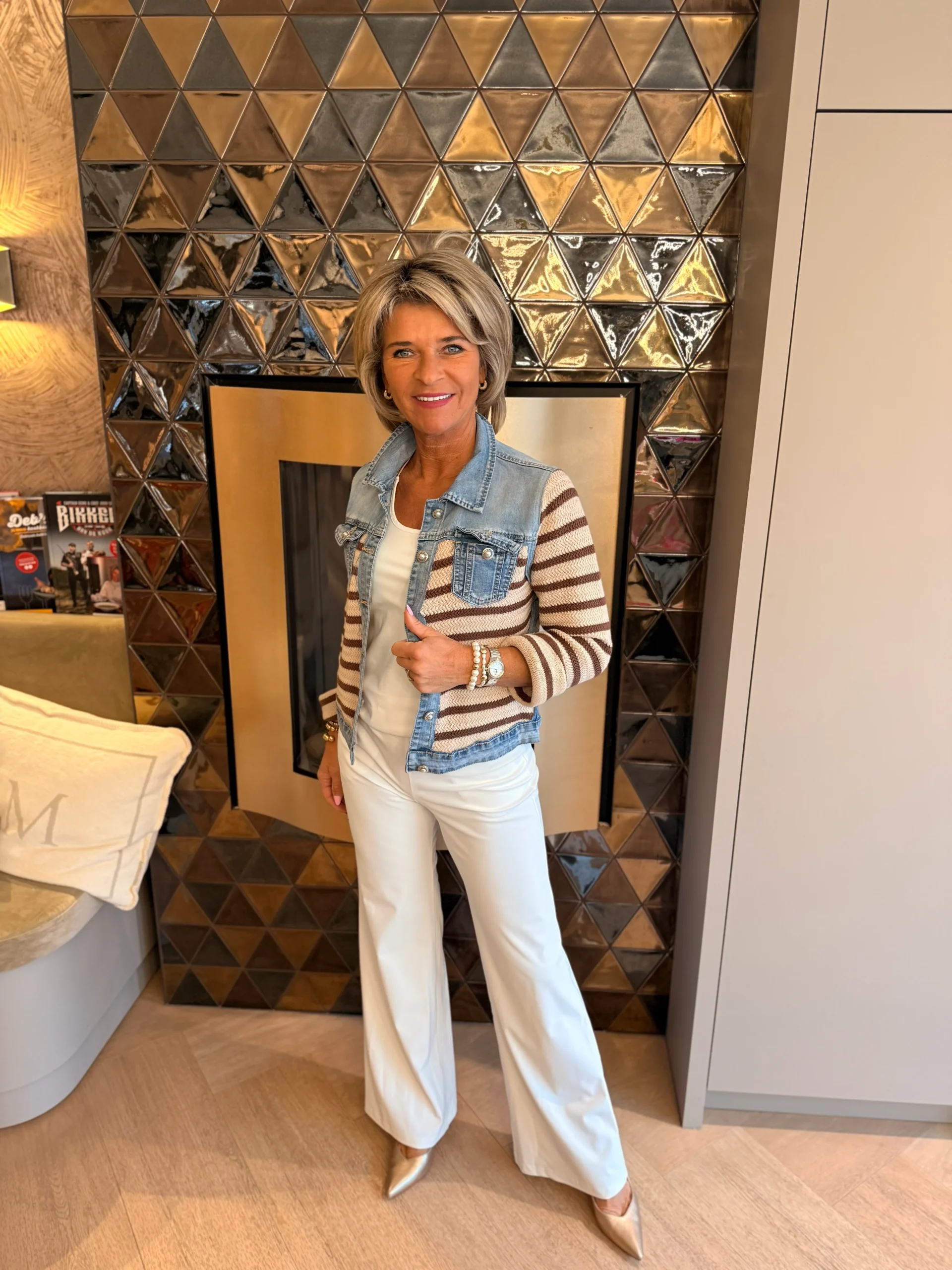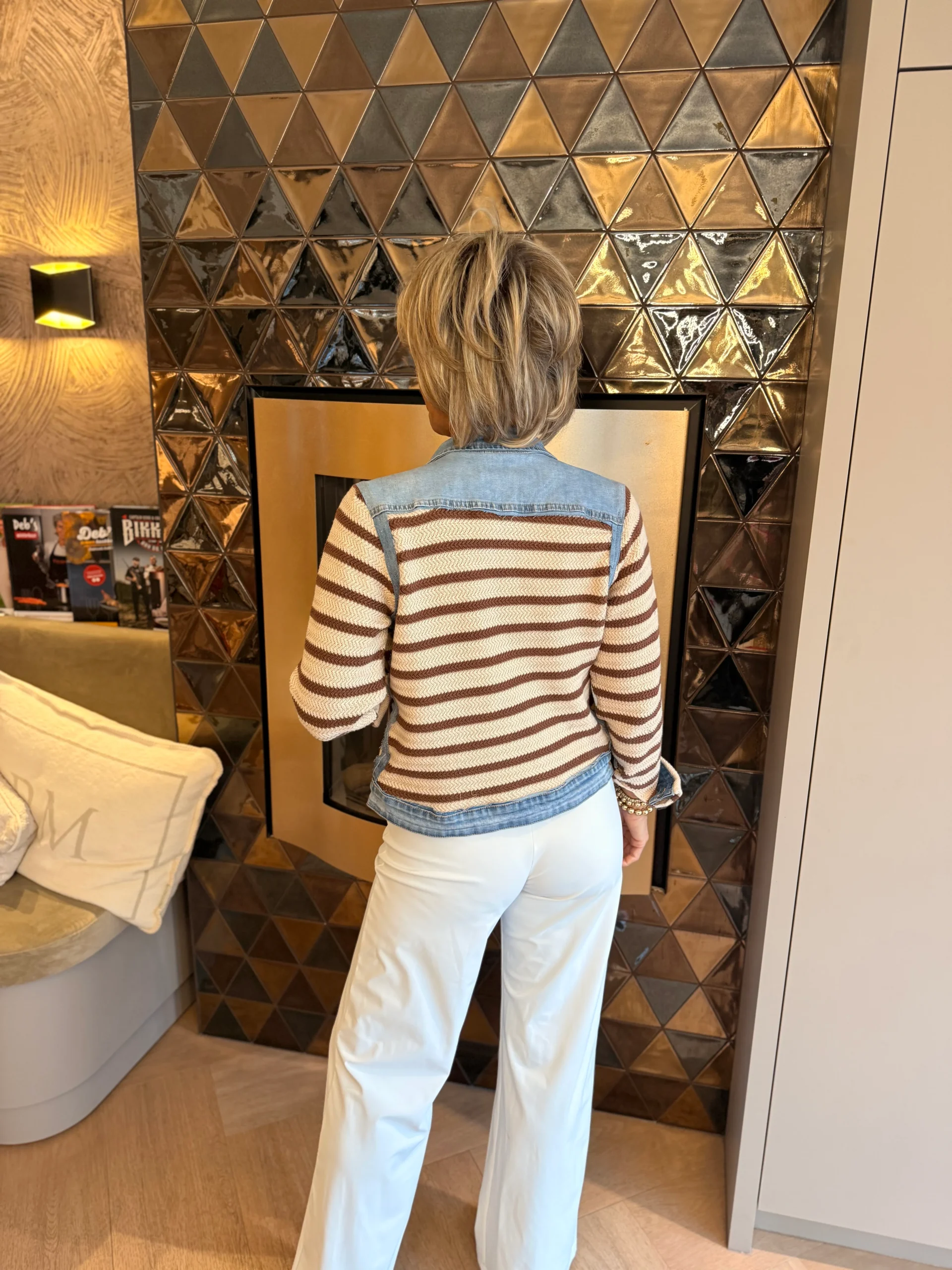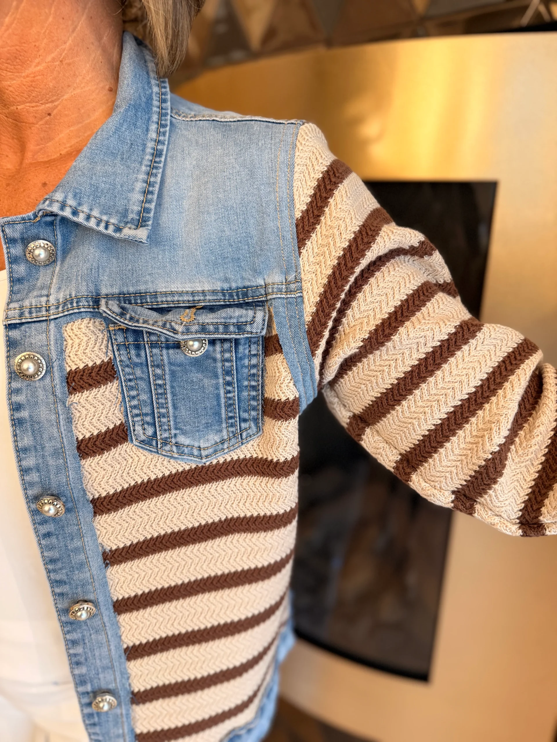 Dit unieke spijkerjasje geeft een verrassende twist aan een echte klassieker! De combinatie van denim met het bruin-wit gebreide voorpand en de mouwen zorgt voor een speelse, stijlvolle uitstraling.