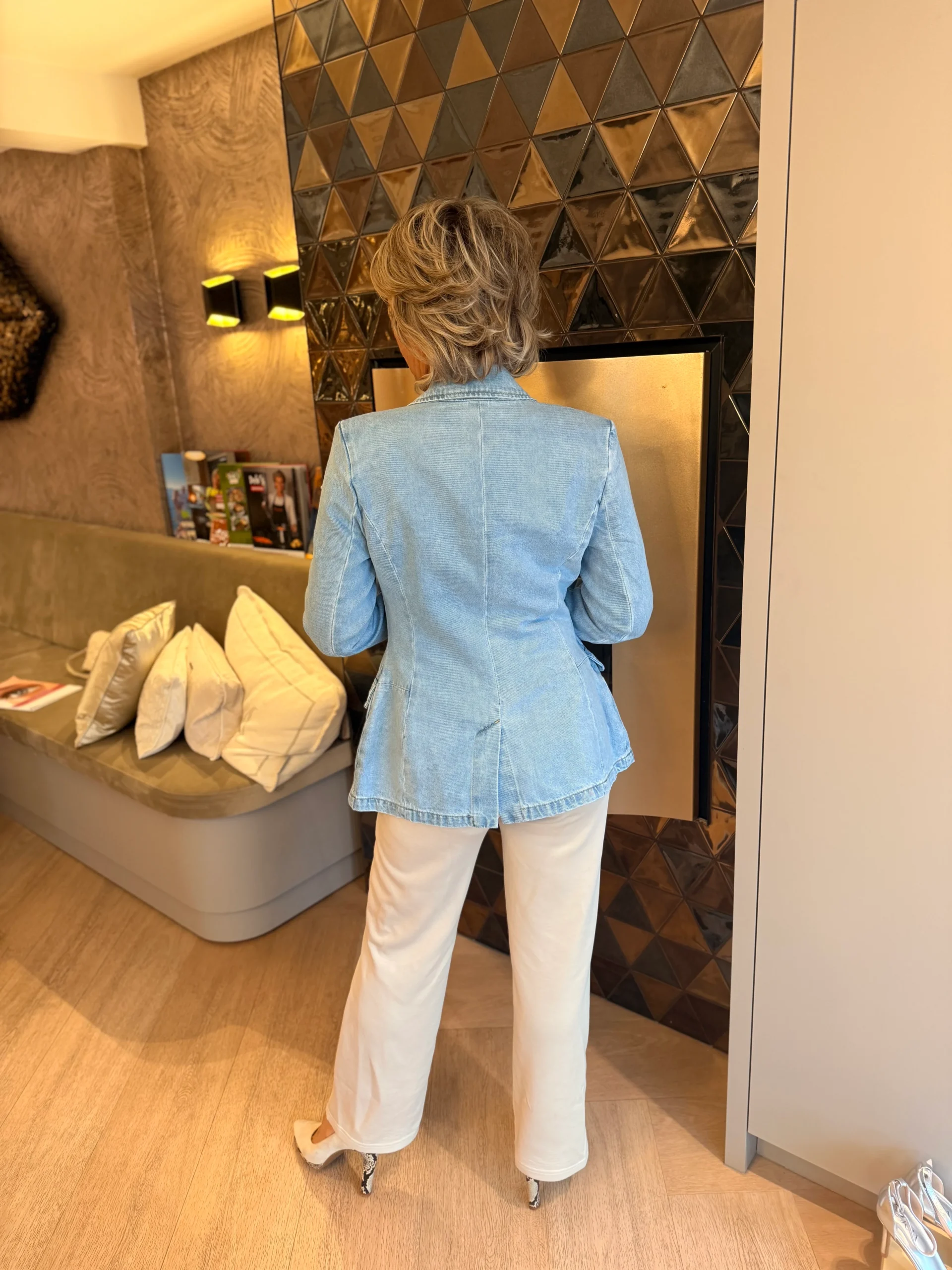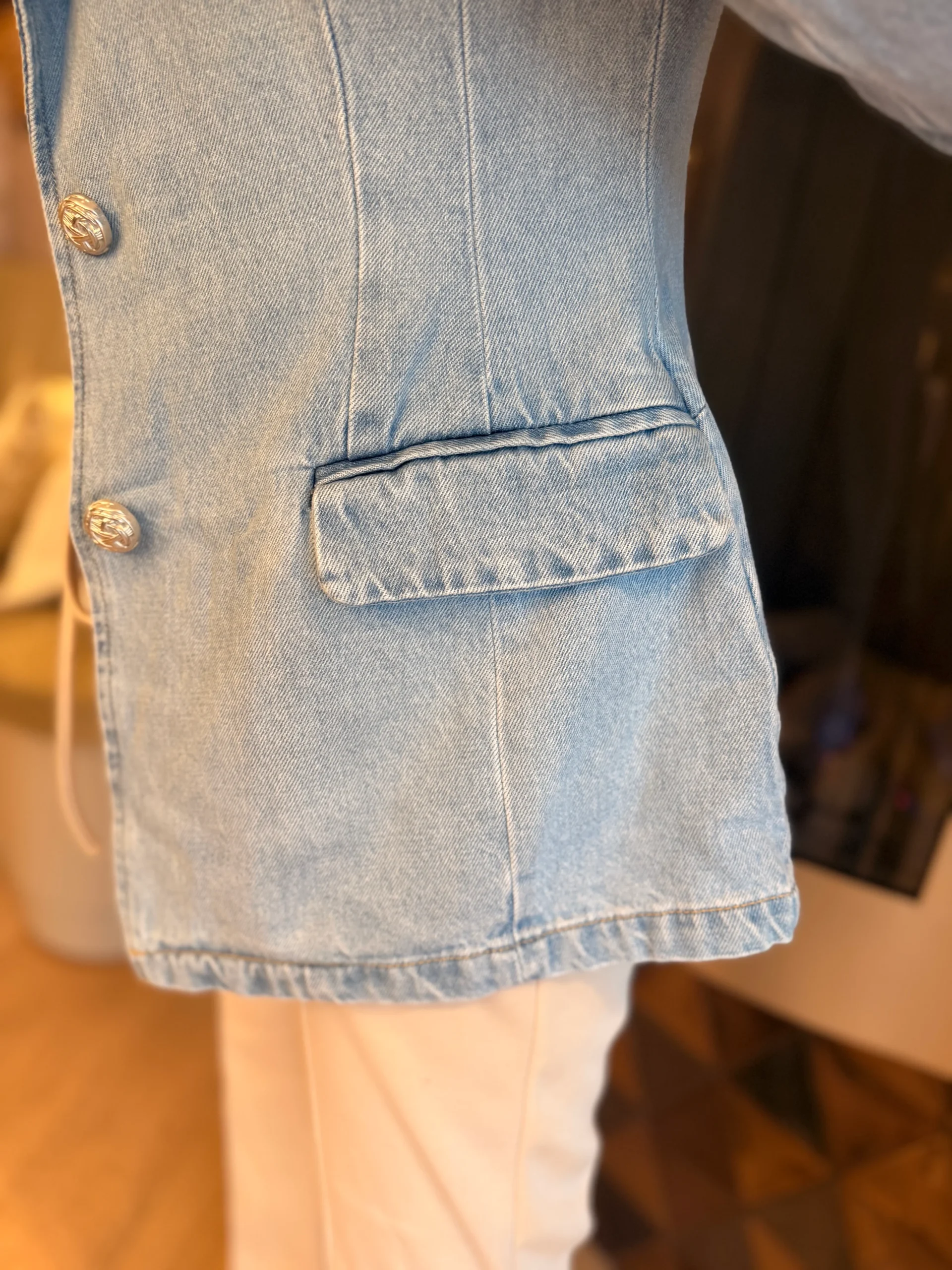 Het jasje is mooi getailleerd en benadrukt subtiel het silhouet. Bovenaan het voorpand is een paspelzakje verwerkt als stijlvol detail. Een veelzijdig denim jasje dat perfect te combineren is met zowel casual als geklede outfits.