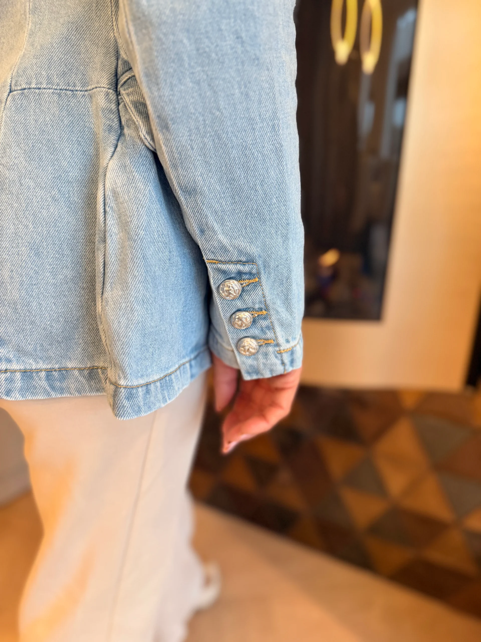 Dit lange spijkerjasje is een tijdloos item met een vrouwelijke en elegante uitstraling. Het jasje is uitgevoerd met een klassieke reverskraag en sluit met twee zilverkleurige knopen. Op het voorpand bevinden zich twee klepzakken, die het ontwerp een stoere maar verfijnde look geven.