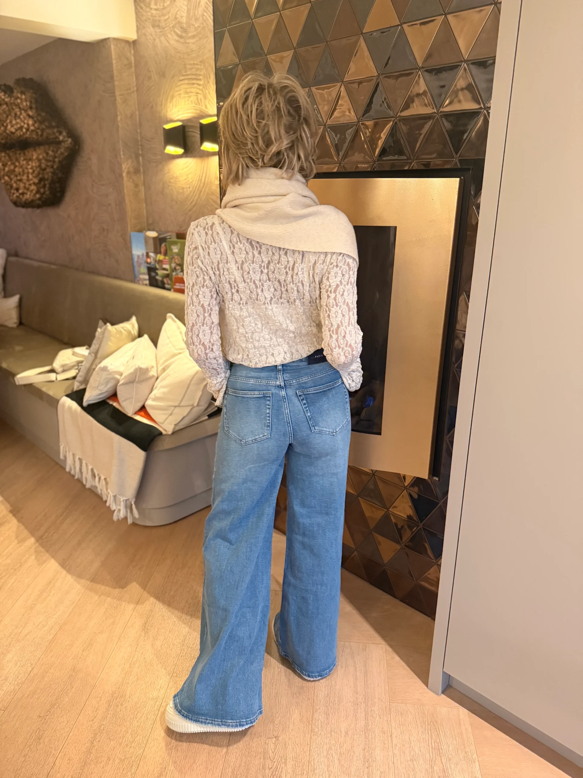 Een moderne ultra wide-leg broek met een tijdloze pasvorm. De broek heeft steekzakken aan de voorkant en achterzakken, wat zorgt voor een praktische maar stijlvolle uitstraling. De lichte wassing geeft de broek een frisse, eigentijdse look. Een veelzijdige broek die vrijwel overal bij past. Binnenbeenlengte maat S 80 cm.