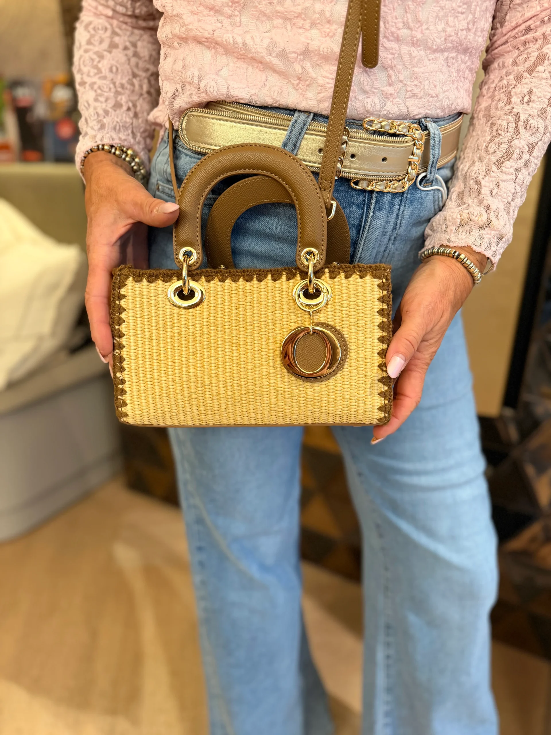 Dit charmante tasje van gevlochten riet straalt een ambachtelijke en zomerse uitstraling uit, dankzij het bruine garen en de decoratieve festonsteek. Het korte hengsel is bevestigd met zilverkleurige ringen, die via extra ringen een speels en stijlvol effect geven.