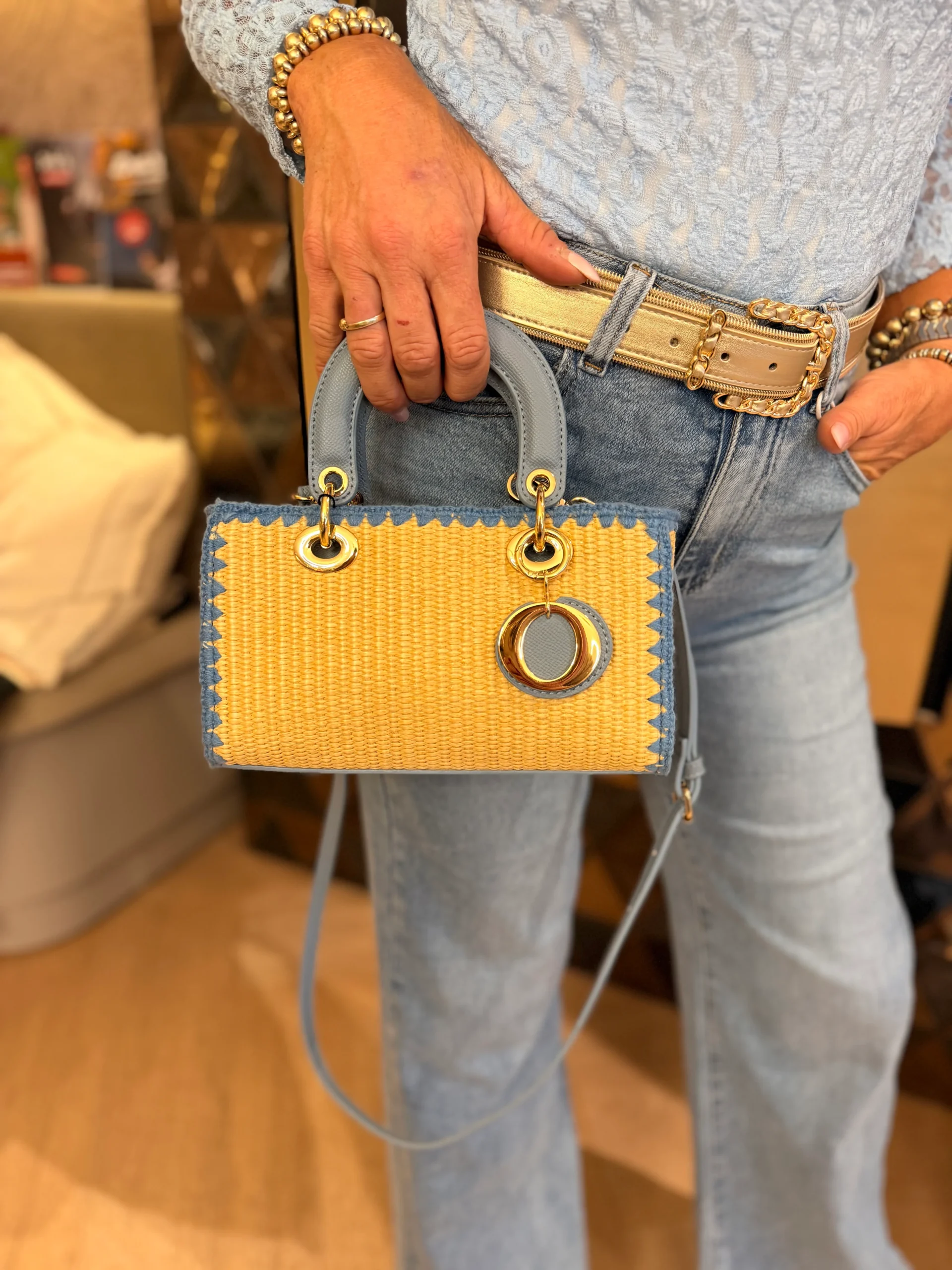 Dit charmante tasje van gevlochten riet straalt een ambachtelijke en zomerse uitstraling uit, dankzij het blauwe garen en de decoratieve festonsteek. Het korte hengsel is bevestigd met zilverkleurige ringen, die via extra ringen een speels en stijlvol effect geven.
