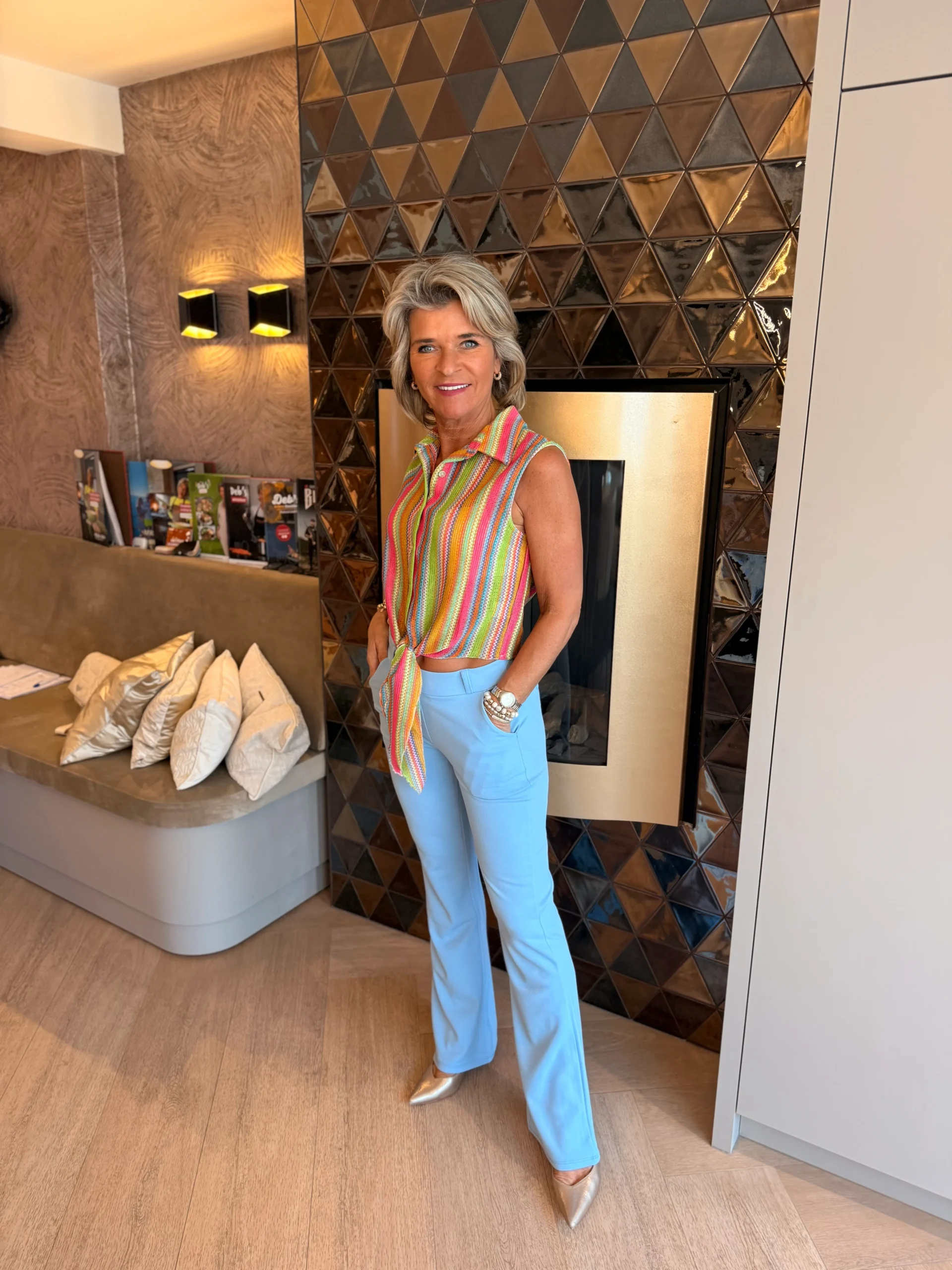 Deze fleurige top geeft je outfit direct een frisse en vrolijke uitstraling. De top is voorzien van een kraagje en een knoopsluiting aan de voorkant, wat zorgt voor een speels maar verzorgd detail. Onderaan zit een strik waarmee je de top leuk kunt tailleren voor een mooie pasvorm. Perfect voor een zomerse en stijlvolle look.