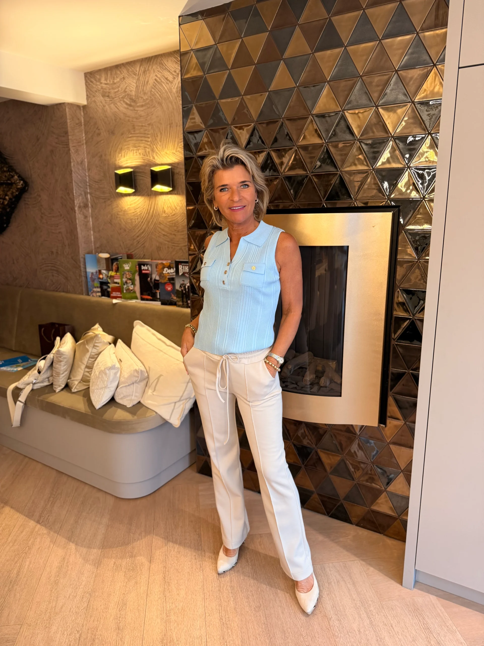 Deze mouwloze top heeft een elegante kraag met een opening van drie gouden knopen. Op het voorpand zitten twee borstzakjes, elk afgewerkt met een gouden knoopje voor een luxe touch. De stof is mega rekbaar en heeft strepen in verschillende breedtes, wat zorgt voor een speels effect. One size, draagbaar tot maat L. Lengte: 53 cm.