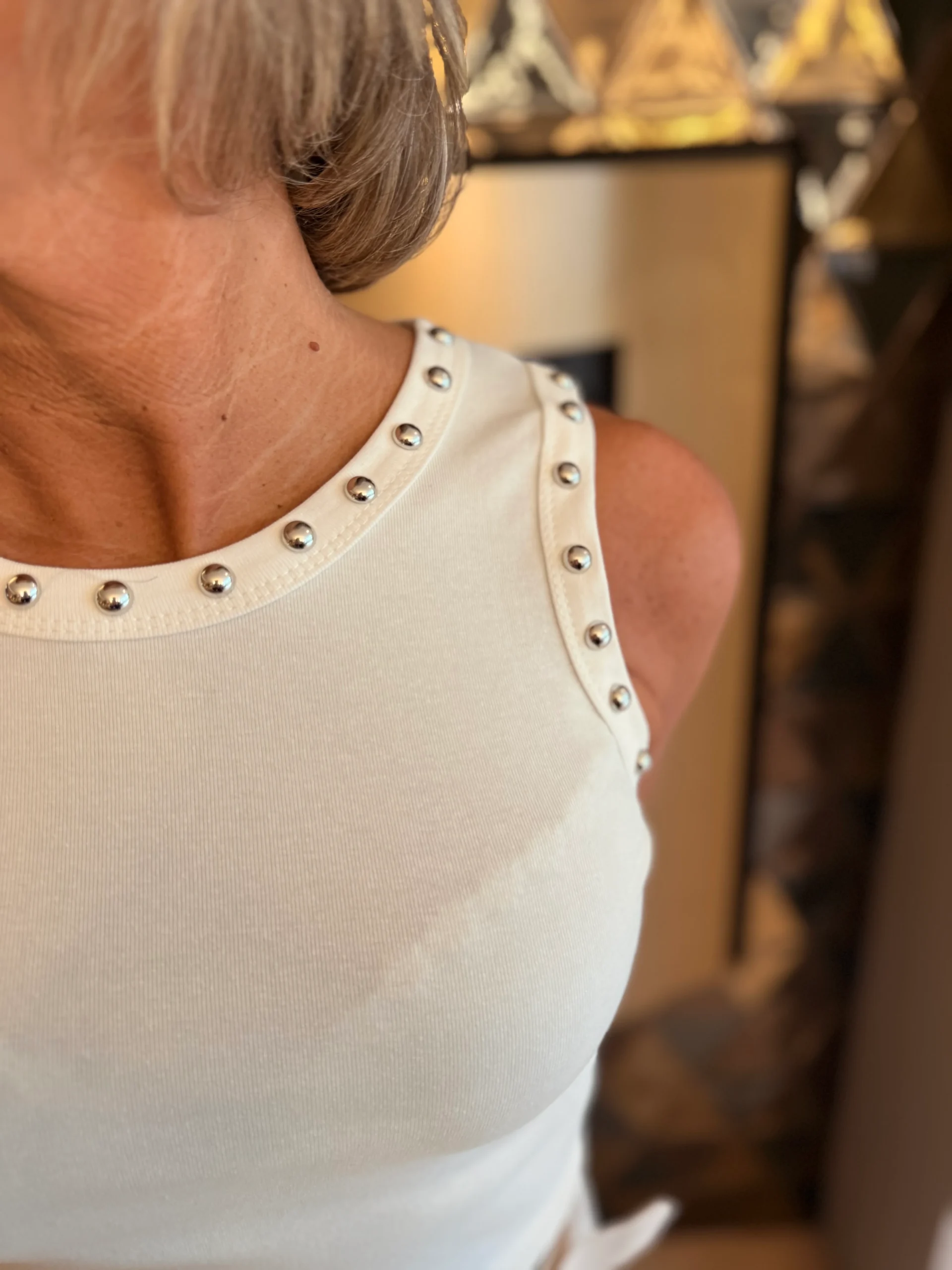 Deze top is een echte eyecatcher dankzij de zilveren studs die de voorkant stijlvol omlijsten. De subtiele glans van de studs geeft een stoere en moderne uitstraling, terwijl het ontwerp toch elegant blijft. Perfect om je outfit net dat beetje extra edge te geven, zowel casual als chic te combineren.