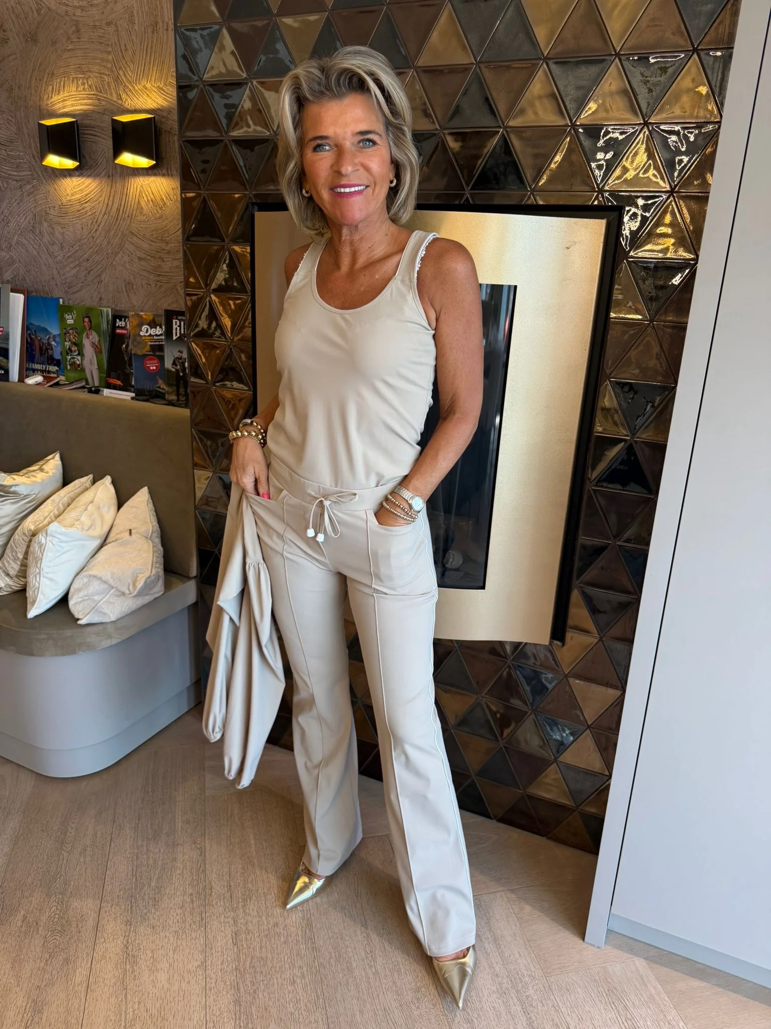 De top is uitgevoerd in een mooie, egale beige kleur en heeft comfortabele, effen banden die zorgen voor een sportieve en moderne uitstraling. Gemaakt van een sterke travelkwaliteit: een soepele, comfortabele stof die mooi in model blijft, nauwelijks kreukt en perfect is voor dagelijks gebruik of om mee te nemen op reis.