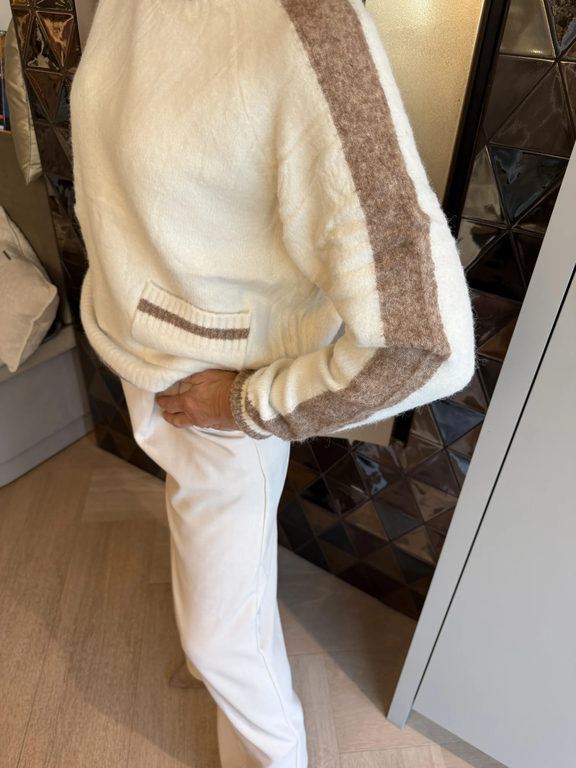 Comfortabele beige trui met witte accenten en een ecru band over de mouwen. Voorzien van twee handige zakken op het voorpand, afgewerkt met witte biezen op de zakken en boorden. De trui heeft een lengte van 58 cm en is one size, waardoor hij comfortabel en veelzijdig te dragen is.