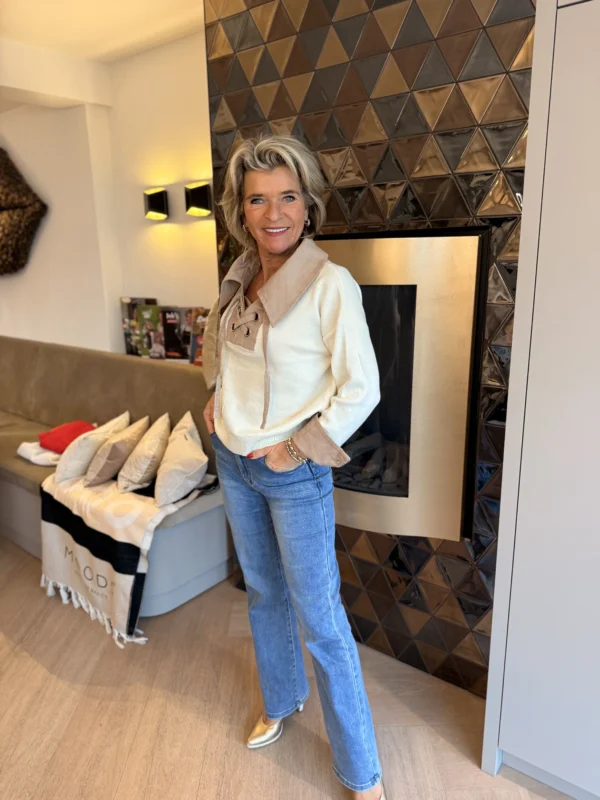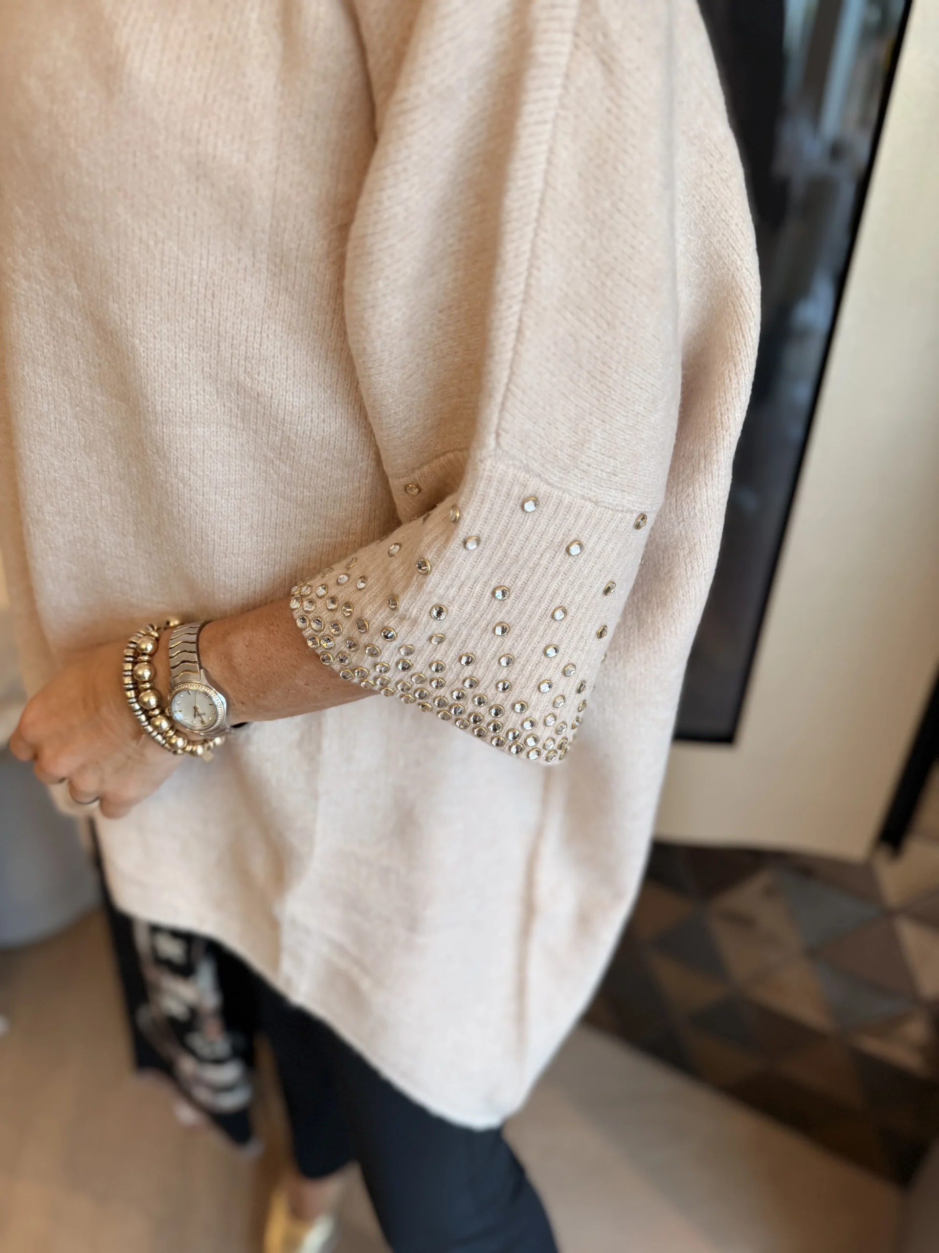 Deze elegante lange trui krijgt een chique touch dankzij de glitterstuds onderaan de mouwen. Gemaakt van een zachte, comfortabele stof die mooi valt en perfect is voor zowel een casual als feestelijke look.