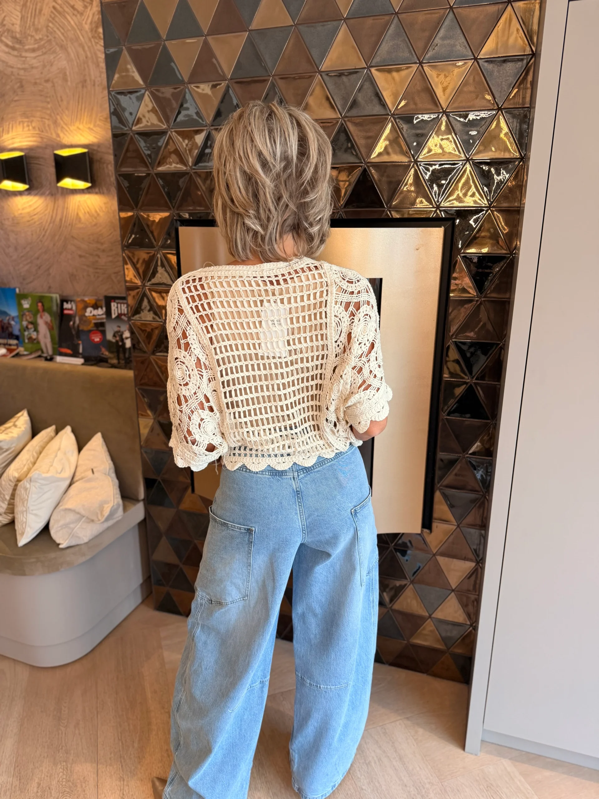 Deze gehaakte trui is een echte eyecatcher dankzij het verfijnde patroon en de ambachtelijke uitstraling. De trui voelt licht en comfortabel aan en is perfect voor zowel casual als iets meer geklede looks. Dankzij de soepele pasvorm is hij draagbaar tot en met maat XL, waardoor hij mooi valt bij verschillende lichaamstypes. Een stijlvolle en veelzijdige toevoeging aan je garderobe.