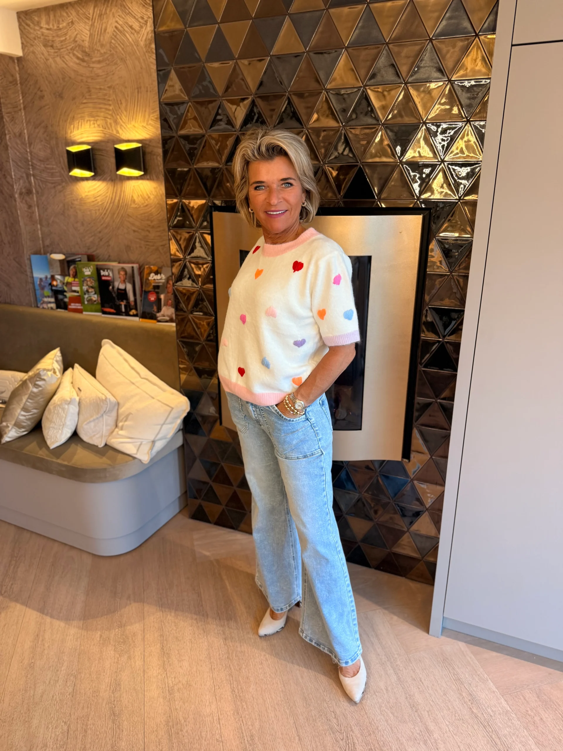 Deze frisse witte trui met vrolijke gekleurde gebreide hartjes is een echte eyecatcher. De roze boorden aan de hals en onderkant geven een speels accent, terwijl de korte mouwen extra leuk zijn afgewerkt met twee verschillende kleuren: geel en lila. Perfect voor een vrolijke, stijlvolle look! De lengte van de trui is 54cm. De trui is te dragen tot een maat XL.