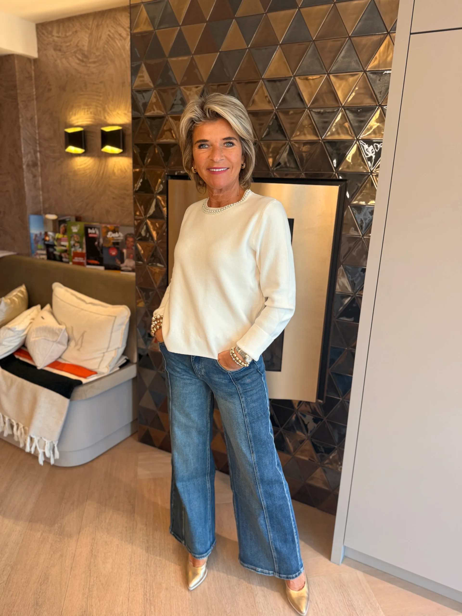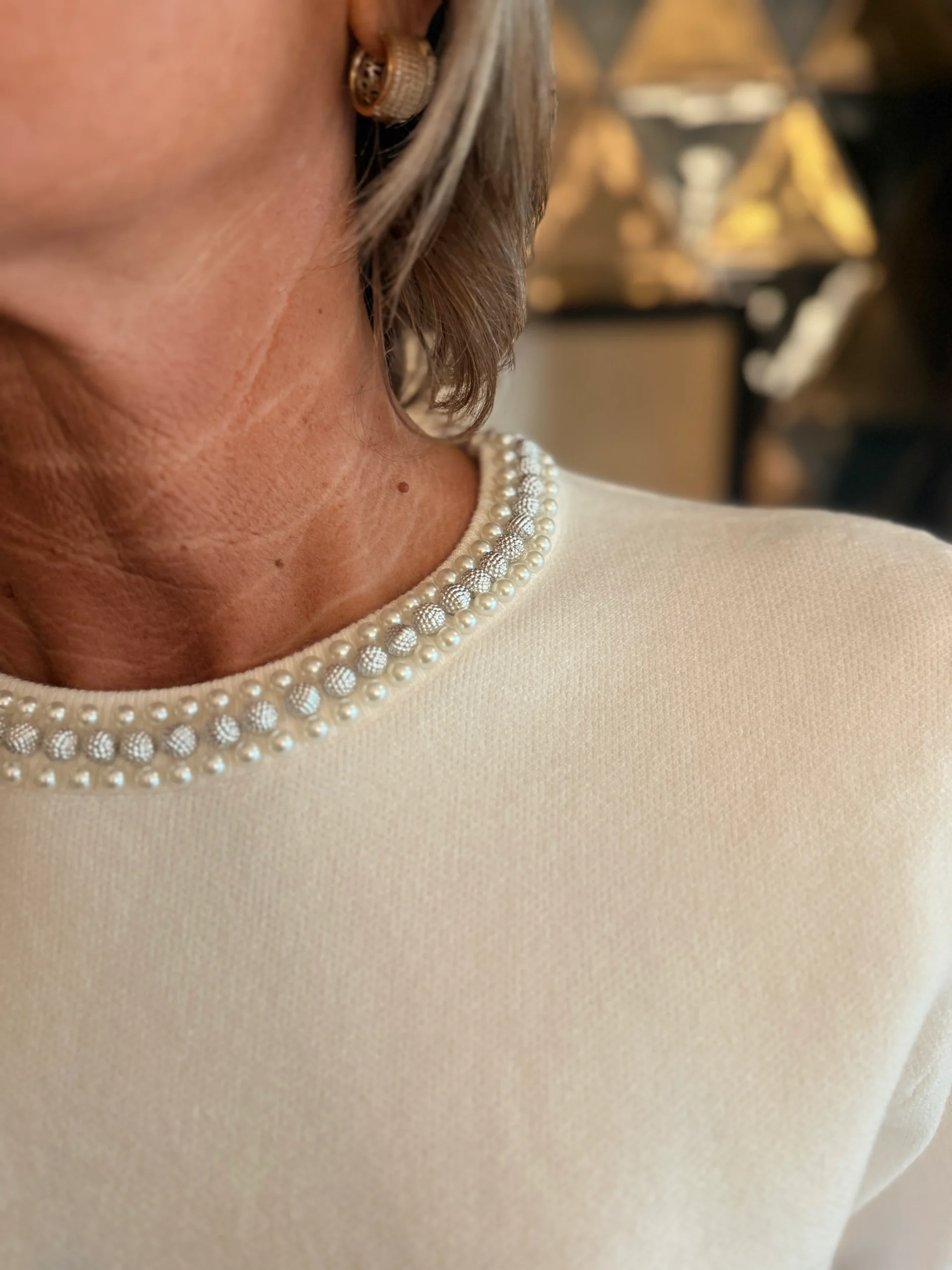 Deze elegante trui is een echte eyecatcher dankzij de drie subtiele randen met parels langs de ronde hals. In het midden loopt een rij iets dikkere zilverkleurige parels, wat de trui een luxe en chique uitstraling geeft.