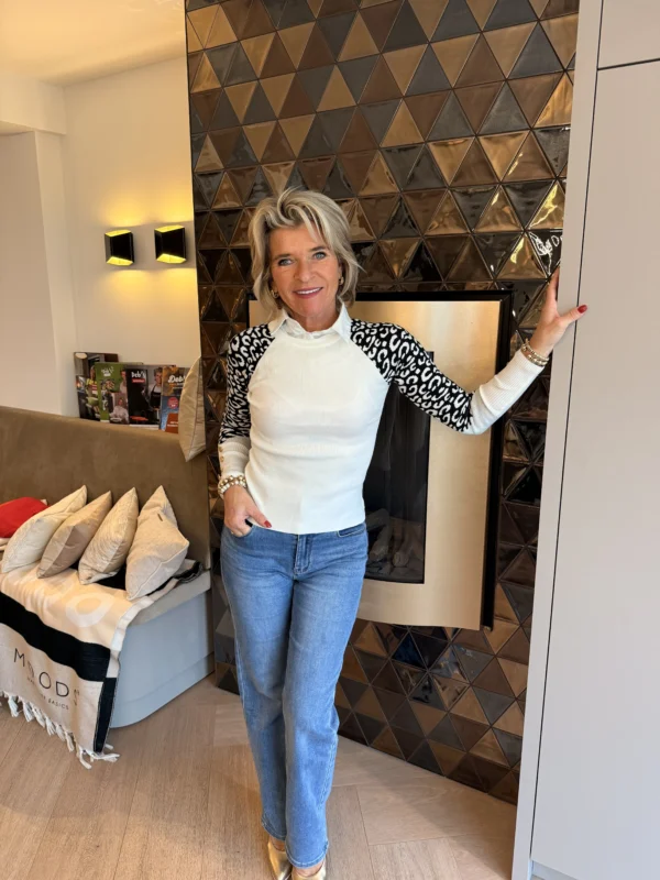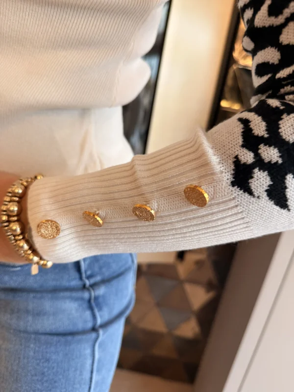 Deze elegante trui met grote hoge kol is versierd met zilveren parels langs de hals voor een verfijnde touche. Heerlijk warm én stijlvol, perfect voor de koudere dagen.
