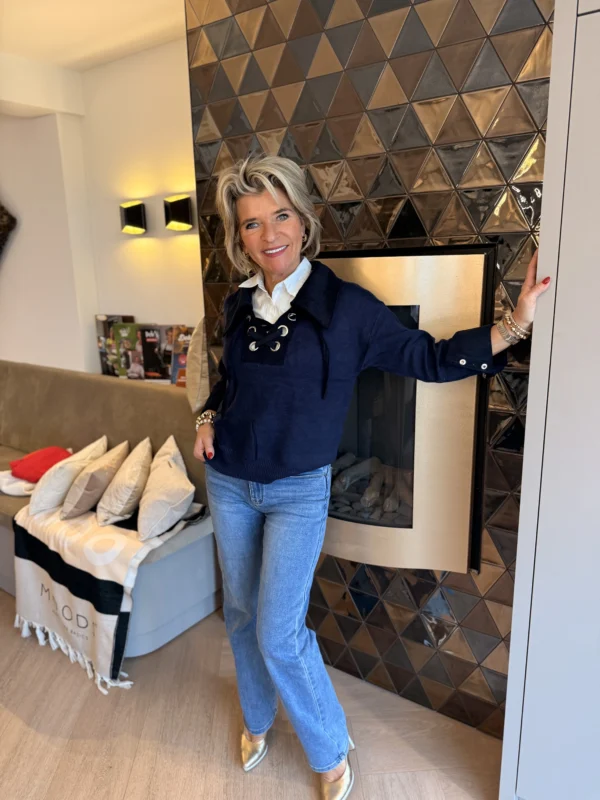 Deze elegante trui met grote hoge kol is versierd met zilveren parels langs de hals voor een verfijnde touche. Heerlijk warm én stijlvol, perfect voor de koudere dagen.