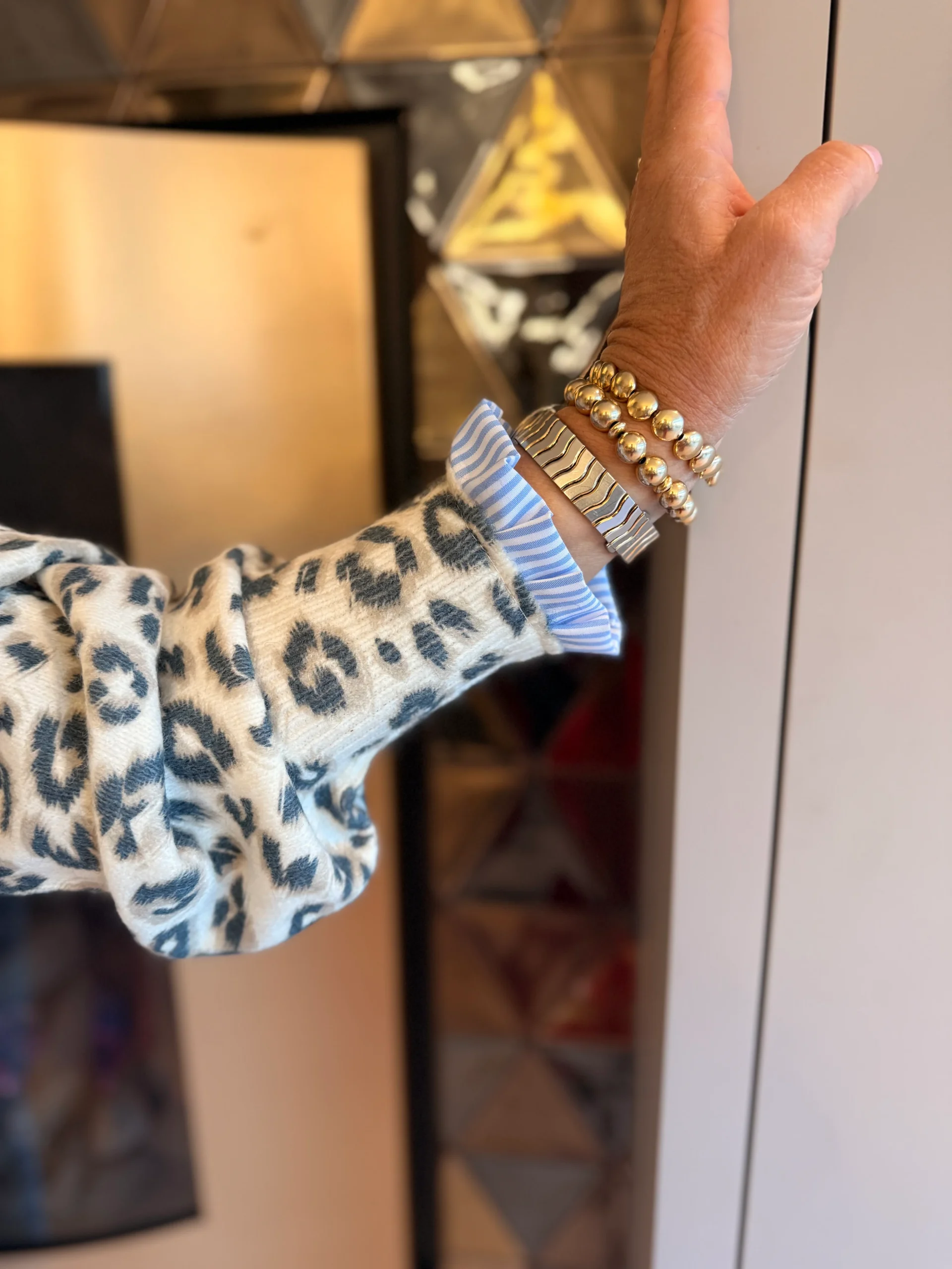 Gebreid vest met een speelse leopardprint en grote knopen, een echte eyecatcher voor je outfit. De hals en onderkant zijn afgewerkt met een geplooid randje van gestreepte stof voor een stijlvol detail. Het vest is one-size en kan zowel open gedragen worden als dicht, waarbij het ook mooi te dragen is als trui. Het vest is te dragen tot een maat XL.