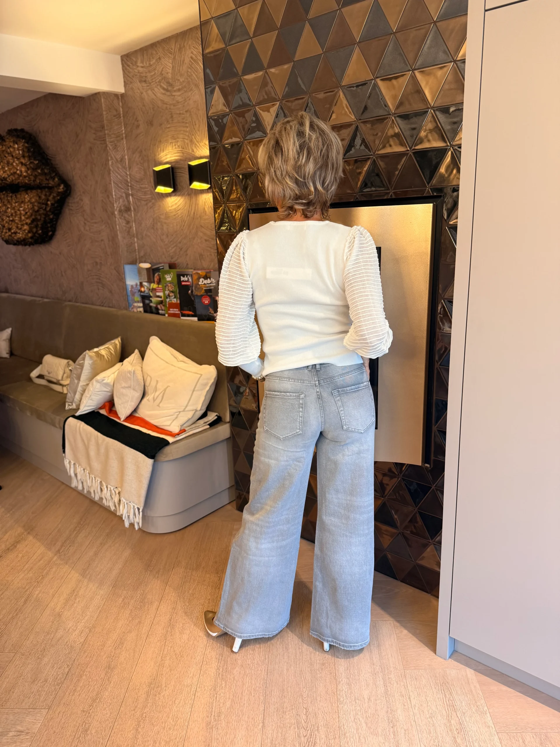 Deze jeans valt net onder de navel en biedt een comfortabele, flatterende pasvorm. De soepel vallende denim en wijd uitlopende pijpen geven de broek een moderne, luchtige uitstraling. Perfect om casual te dragen met een T-shirt of wat chiquer met een blouse—een veelzijdige essential voor elke garderobe.