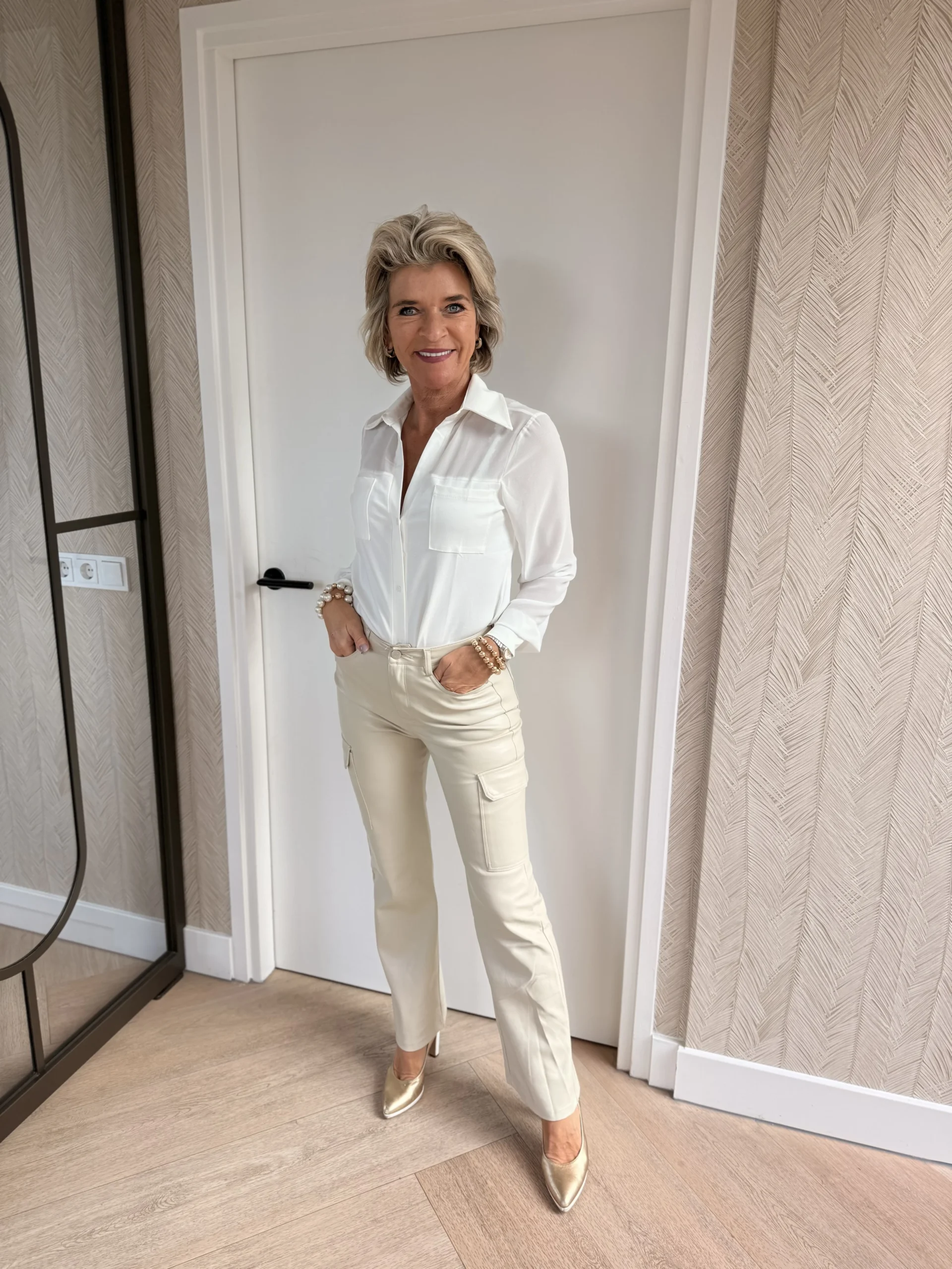 Deze elegante blouse combineert twee prachtige materialen voor een stijlvolle en verfijnde look. De bovenkant en mouwen zijn van doorschijnend voile stof, terwijl de kraag, manchetten en onderkant zijn uitgevoerd in een zachte viscose mix. Voorzien van twee borstzakken voor een moderne touch.
