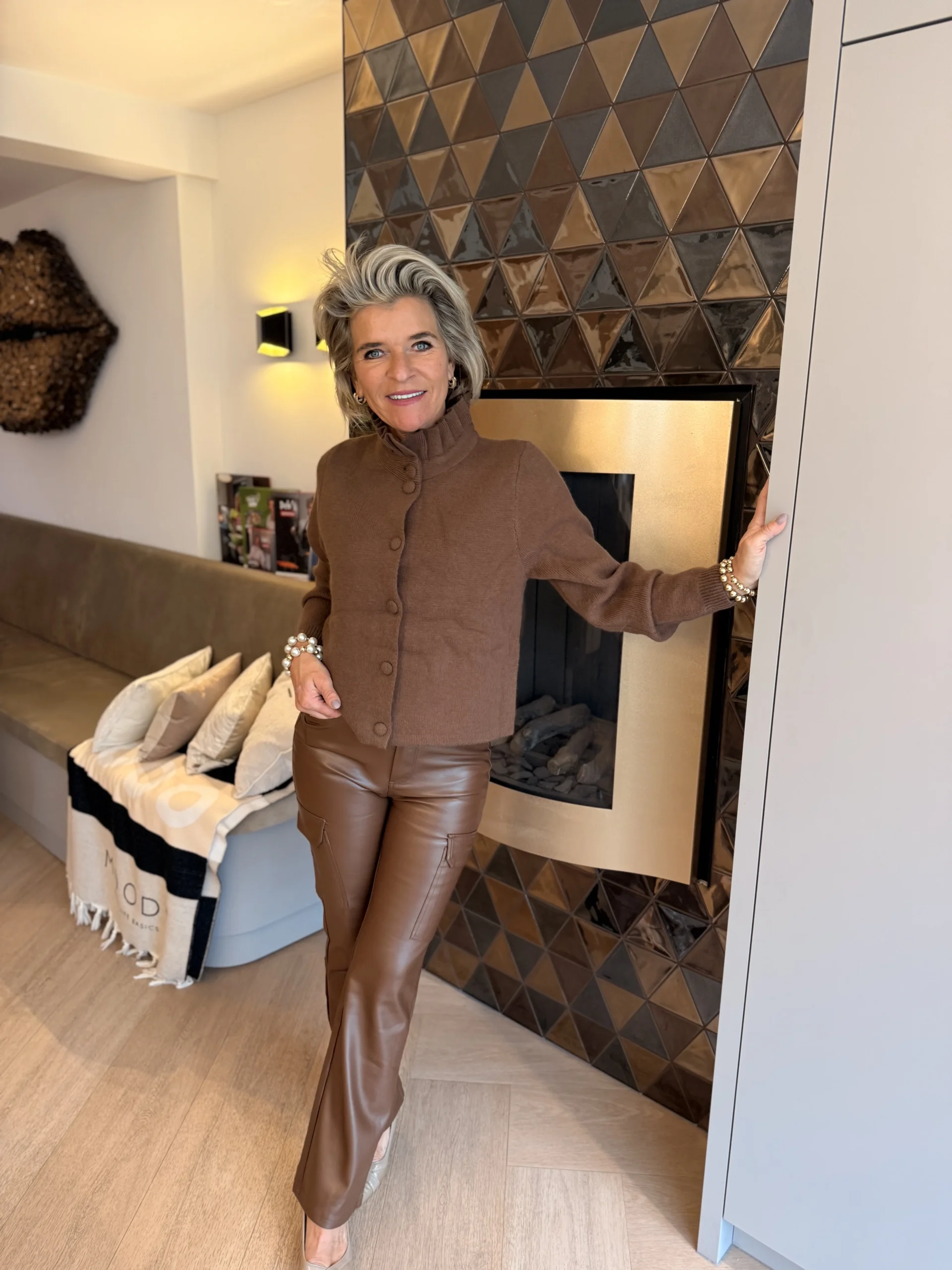 Elegante trui met pierrotkraag en bijpassende stofknopen. De onderkant en mouwen vallen recht, wat zorgt voor een tijdloze en verzorgde look. Perfect te combineren met een jeans of pantalon.